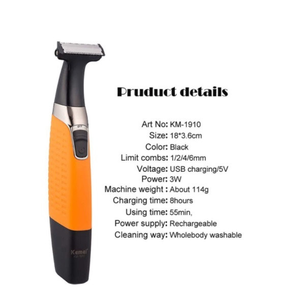 استفاده از ماشین اصلاحی که بتواند موهای بدن را زیر دوش یا با استفاده از فوم کوتاه کند، برای بسیاری از مردان مهم است. KM-1910 که توسط شرکت «کیمی» (Kemei) تولید شده، دارای قابلیت شستشو و مقاومت در برابر آب است که موجب کوتاه کردن راحتتر موهای بدن میشود. این محصول سریهای قابل شستشو نیز دارد که در صورت استفاده از فوم و خمیر ریش میتوان آنها را شست. تیغههای از جنس استیل ضدزنگ این دستگاه ،به مقاومت دستگاه در برابر رطوبت و زنگزدگی میافزاید. برای KM-1910 باتری قابل شارژ بهعنوان منبع تغذیه در نظر گرفته شده است. این محصول 3 شانه در اندازههای مختلف دارد که موجب کوتاه شدن موهای بدن در 4 اندازه ی مختلف میشود. همچنین با استفاده از سری تریمر این دستگاه میتوان موهای بدن را در اندازهی 0.2 میلیمتر کوتاه کرد و از داشتن تهریشی زیبا لذت برد . از اقلام همراه این مدل میتوان به روغن اشاره کرد که موجب راحتتر حرکت کردن تیغههای ماشین اصلاح میشود. با استفاده از برس تمیز کننده میتوان موهای باقی مانده در دستگاه را تمیز کرد.از نکات جالبی که میتوان در استفاده کردن از این دستگاه اشاره کرد، طراحی مناسب بدنه است که در دست گرفتن و قرار دادن آن را روی پوست صورت آسانتر میکند. KM-1910 دارای تیغه از جنس استیل ضد زنگ، قابلیت شستشو، سری قابل شستشو، منبع تغذیهی باتری قابل شارژ است.