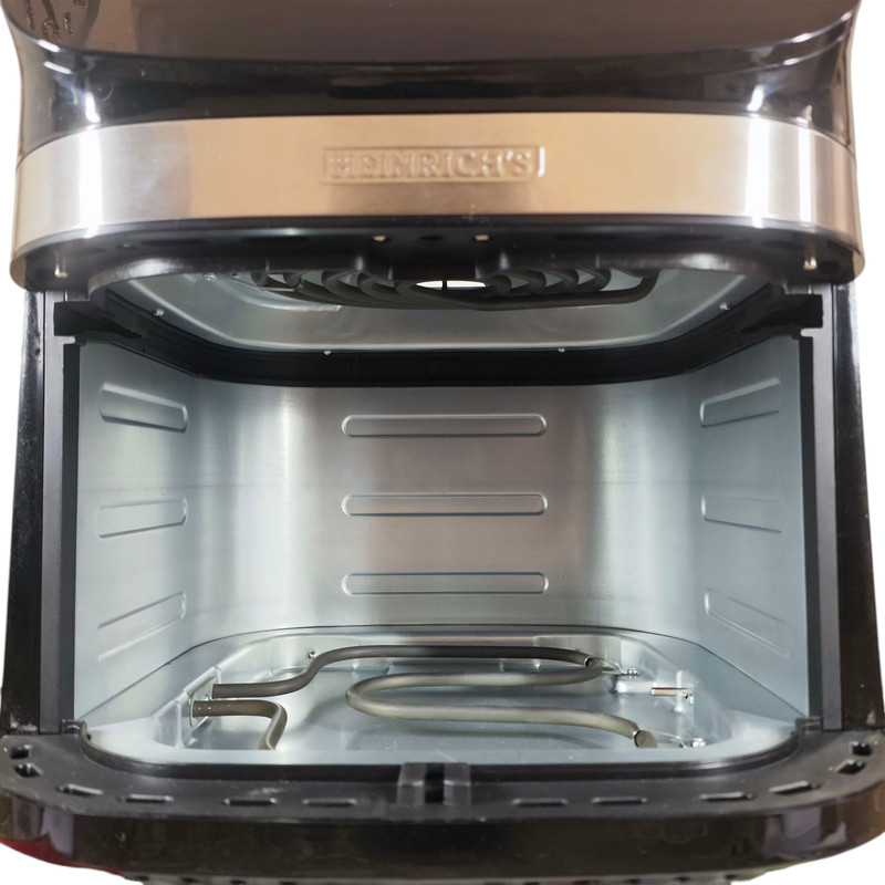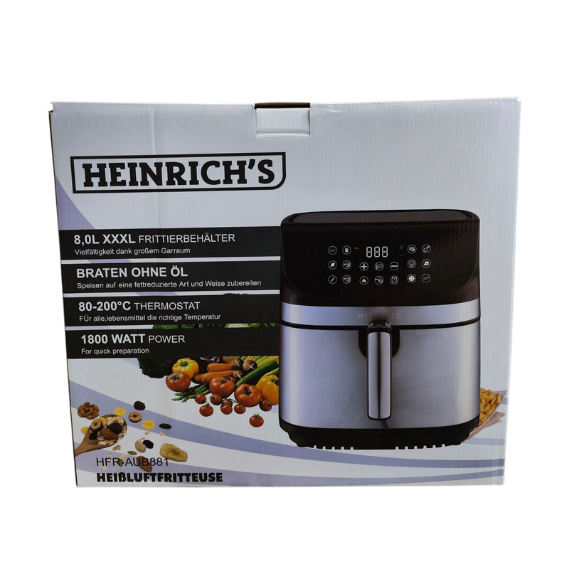 سرخکن بدون روغن HEINRICH’S مدل HFR-AUB881 — دستگاهی چندکاره و قدرتمند که سلامتی و راحتی را در آشپزی روزمره با هم ترکیب میکند. روی جعبه با تأکید «XXXL 8.0L» آمده که نشاندهندهٔ ظرفیت بزرگ این مدل است؛ ظرفیتی که برای خانوادههای متوسط و مهمانیهای کوچک طراحی شده و بهقدری جا دارد که یک مرغ کامل بزرگِ خانگی بهراحتی داخل سبد قرار میگیرد. با توان ۱۸۰۰ وات و فناوری گردش هوای گرم (Air cycling)، دستگاه در کوتاهترین زمان دمای بالاتر را پخش میکند تا سطح غذا ترد و داخلی آن نرم باقی بماند — نتیجهای نزدیک به سرخکردن سنتی با مصرف روغن بسیار کمتر.