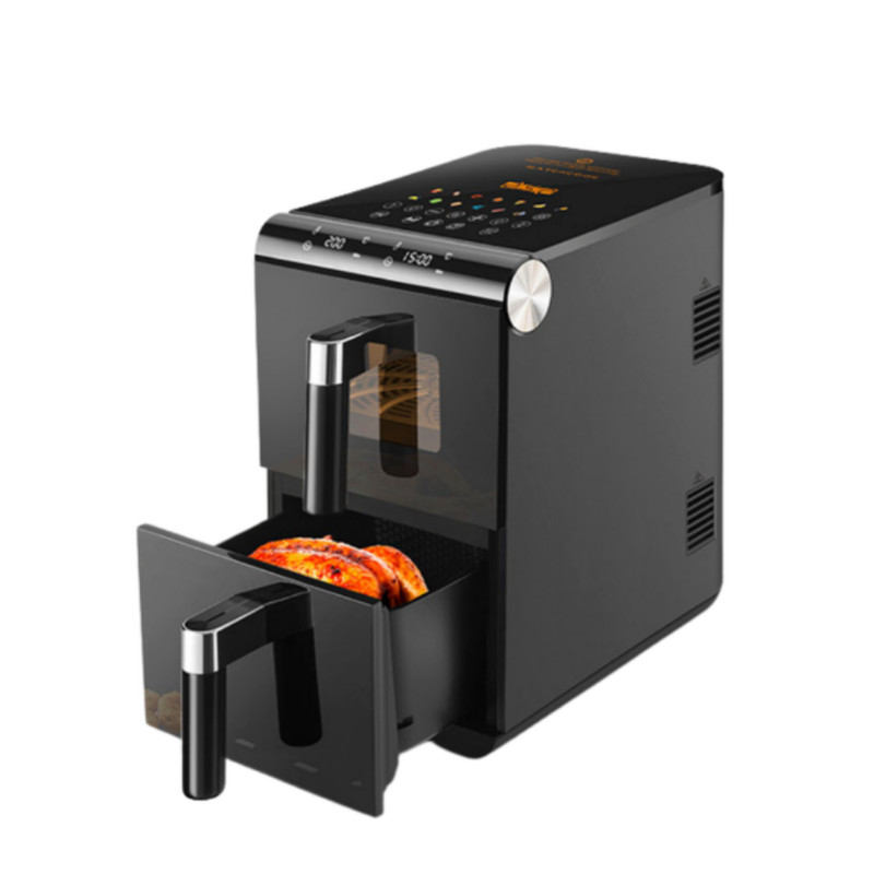 پنجره روی سبد و لامپ داخلی به شما اجازه میدهد بدون باز کردن درب، روند پخت را ببینید؛ این ویژگی هم در حفظ دما مؤثر است و هم از هدررفت انرژی جلوگیری میکند. بدنهی ترکیبی از پلاستیک نایلون و مواد ABS+PC+PP علاوه بر استحکام، وزن دستگاه را کنترل شده نگه میدارد.