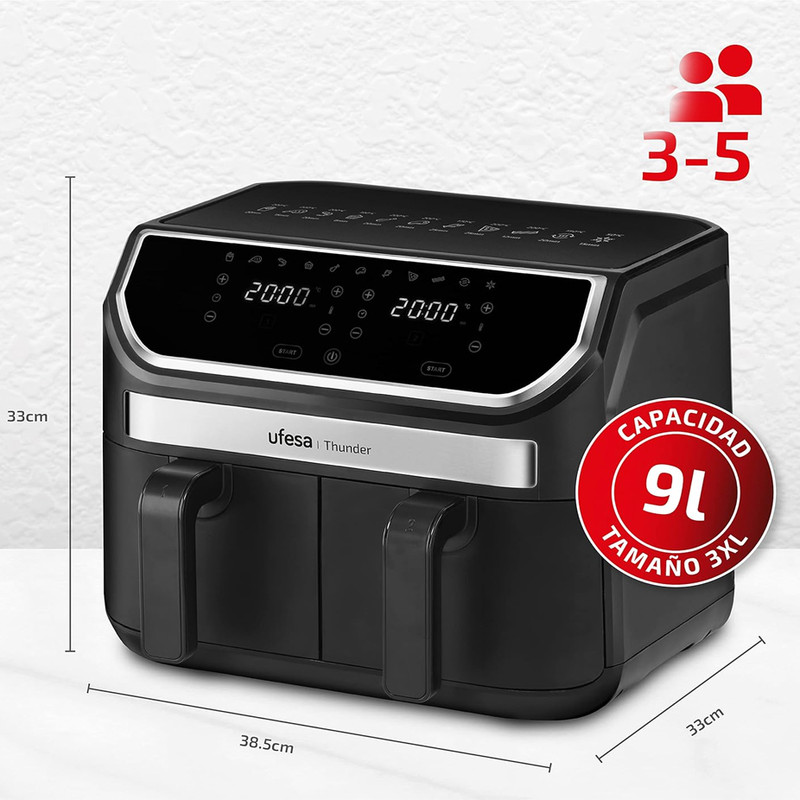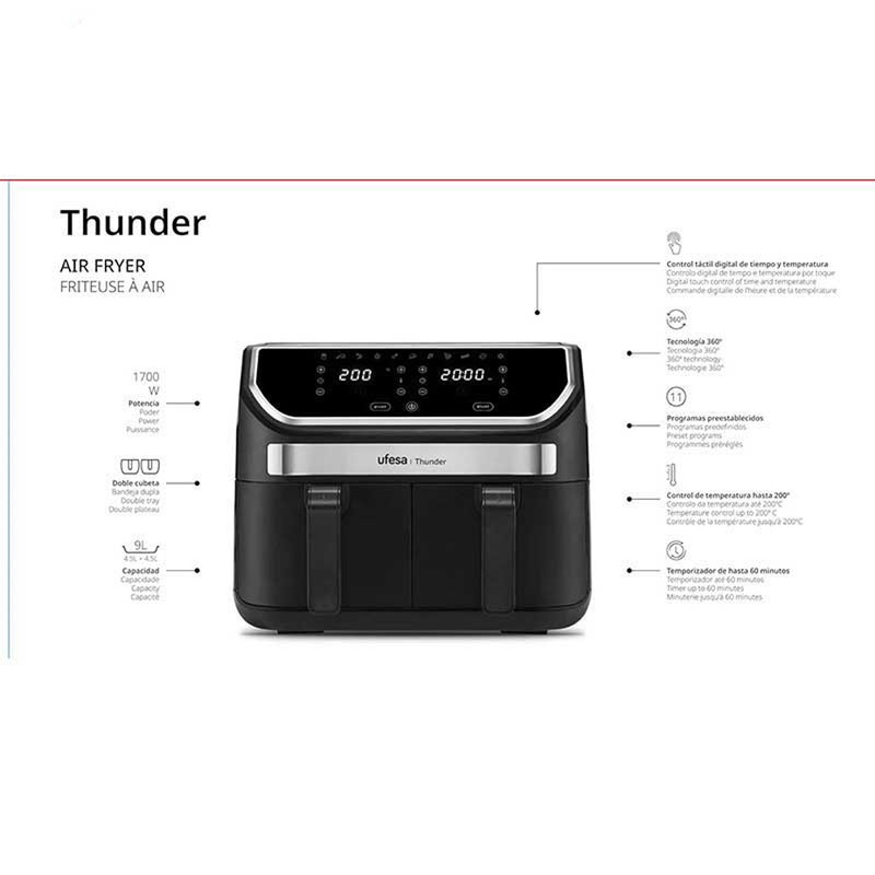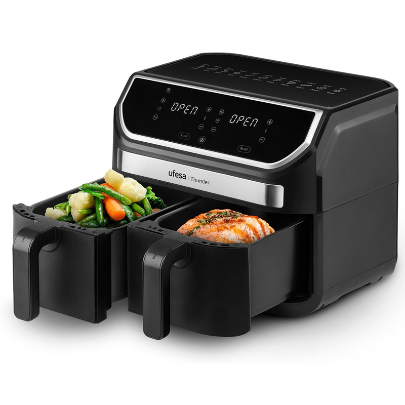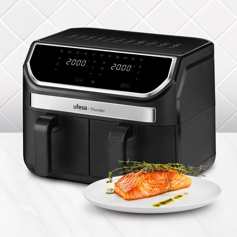 سرخ کن دوقلو بدون روغن مدل Thunder یکی از کاربردی ترین سرخ کن های موجود در بازار بوده که توسط برند معتبر یوفسا طراحی و تولید شده است. این سرخ کن با دو مخزن و محفظه جداگانه ساخته شده و به همین دلیل شما می توانید در یک زمان دو غذای متفاوت را آماده کنید. این سرخ کن بدون روغن ساخته شده و دارای توان مصرفی 1700 وات می باشد. هر کدام از محفظه های این سرخ کن نیز دارای ظرفیت 4.5 لیتر می باشند و با فناوری گردش هوای 360 درجه به شما این امکان را می دهند که بدون افزودن روغن غذای خود را آماده کنید.