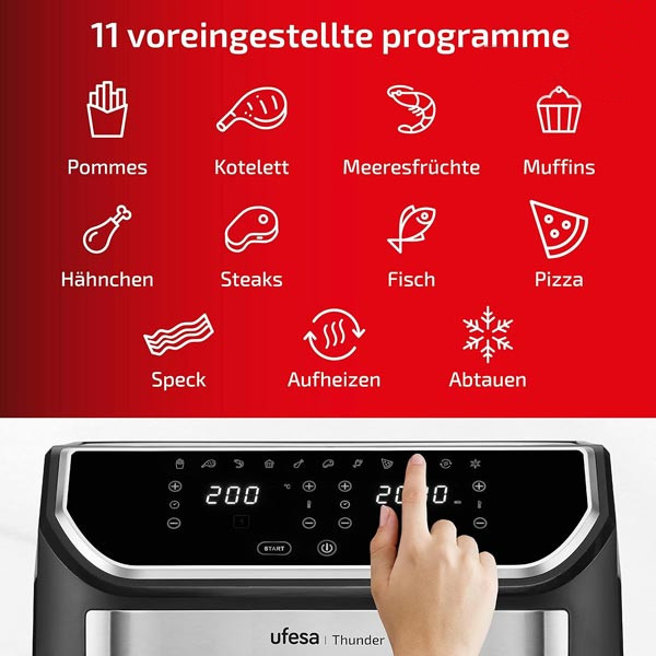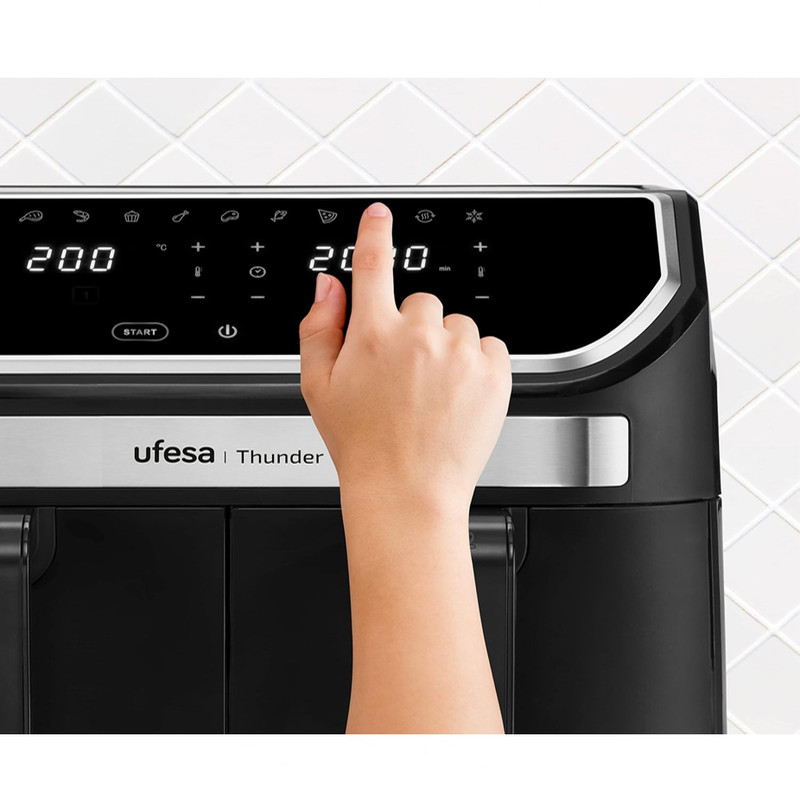 کنترل پنل دیجیتالی سرخ کن یوفیسا مدل Thunder دارای 11 برنامه از پیش تعیین شده می باشد که شامل پخت؛ سیب زمین سرخ کرده، شنسیل، غذا های دریایی، مرغ، گوشت، ماهی، پیتزا، پیش گرم کردم، یخ زدایی و … است. به علاوه این کنترل پنل به صورت لمسی بوده و زمان و دمای آن از 80 تا 200 درجه سانتی گراد قابل تنظیم است. همچنین یکی دیگر از مزیت های این محصول این است که پس از سپری شدن مدت زمان تنظیم شده به طور خودکار خاموش خواهد شد.