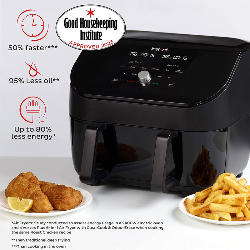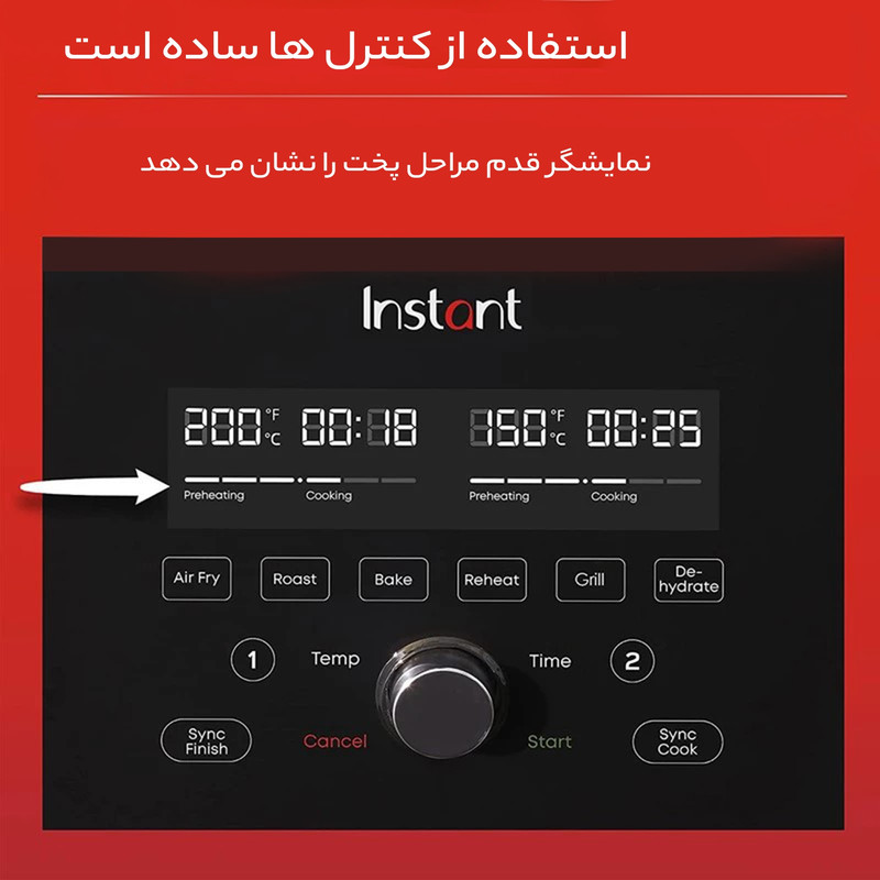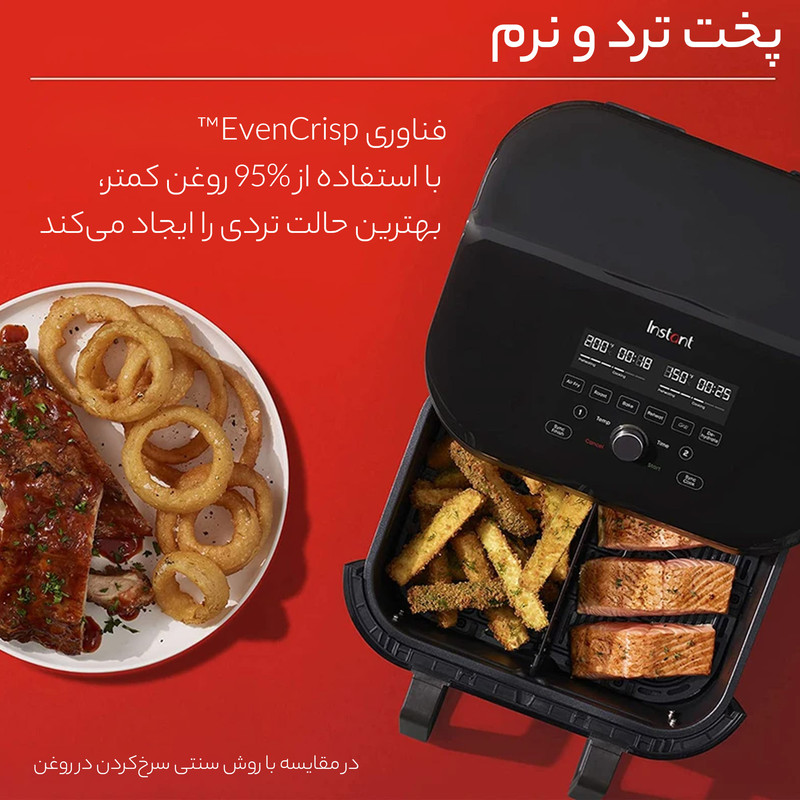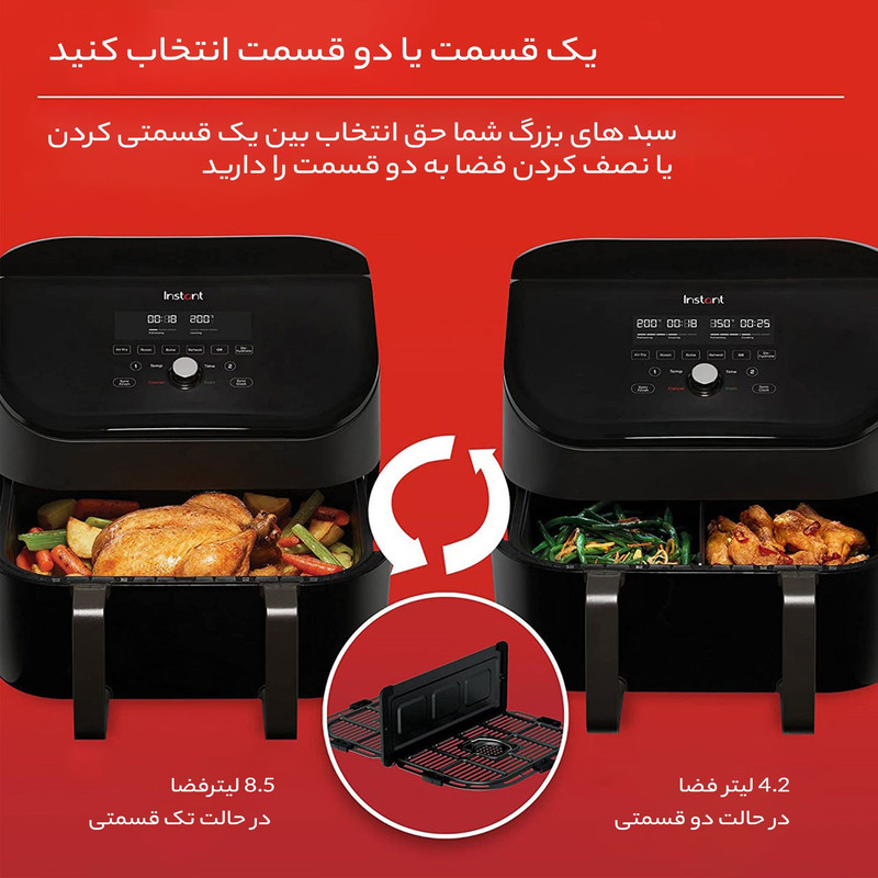 - سایر توضیحات: دو مخزن با ظرفیت 4.25 لیتر که به وسیله یک جداکننده (دیوایدر) از هم جدا شده اند و با برداشتن آن می توانید از تمام ظرفیت 8.5 لیتر هم استفاده نمایید / برنامه های پخت شامل (پخت، کباب کردن، گریل کردن، گرم کردن مجدد، سرخ کردن ، میوه و سبزی خشک کن (آبگیری) به همراه هماهنگ سازی پخت و هماهنگ سازی اتمام پخت) /