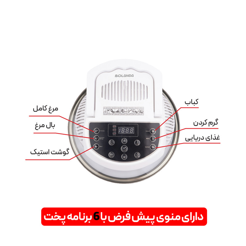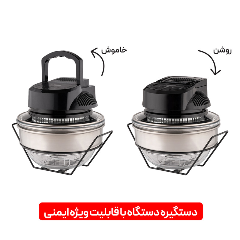 • سایر توضیحات: تنظیم دیجیتال زمان و دما ، مجهز به تایمر ، تنظیم زمان از 0 الی 180 دقیقه ، تنظیم حرارت از 60 الی 250 درجه سانتیگراد ، تنظیم زمان تاخیر از 10 الی 19:50 دقیقه ، دارای منوی پیش فرض با 6 برنامه پخت ، سرخ کن با هوا ، گریل کردن ، گرم کردن غذا و کباب کردن ، تمیز کردن آسان ، آشپزی آسان ، 2 تا 3 برابر سریع تر از اجاق معمولی ، پخت یکنواخت با استفاده از فن جهت یکنواخت کردن دما ، قابلیت افزایش ظرفیت از 3.5 لیتر تا 8 لیتر ، دارای گارنتی یک ساله و دفترچه راهنمای کامل محصول