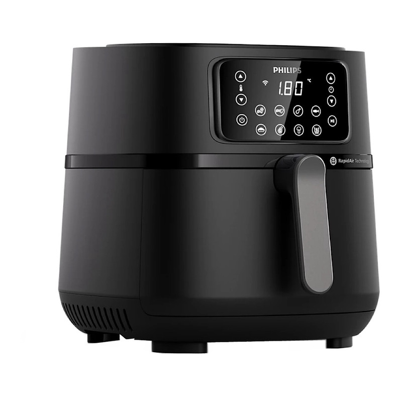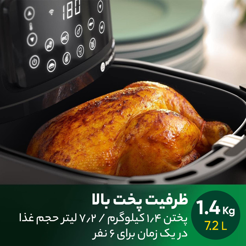 سرخکن های بدون روغن نسل جدید فیلیپس هر آشپزخانه ای را از هر وسیله پخت و پز مانند قابلمه ، فر ،کیک پز ، تنور و ….بی نیاز میکند . مدل HD9285/93 با ظرفیت 7.2 لیتر واقعی مناسب برای خانواده های پرجمعیت نیز است زیرا در هر بار استفاده به راحتی میتواند غذای 7 نفر را آماده کند . این مدل توانایی ارایه 16 نوع پخت (سرخ کردن ، پختن ، گریل کردن ، کباب کردن ، تست ، یخزدایی ، تخمیر ، آبگیری ، گرم کردن مجدد و… ) را دارد . سرخکن hd9285/93 فیلیپس دارای یک قالب کیک مخصوص است که در دیگر مدل های hd9285 این قالب وجود ندارد . شما به راحتی میتوانید با کمک این قالب مخصوص که کمپانی فیلیپس طراحی کرده است انواع کیک ، لازانیا ، تهچین و … را آماده کنید . با قابلیت کنترل از راه دور (اتصال به اینترنت ) به راحتی میتواید دستورالعمل غذا را انتخاب کنید و به سرخ کن بفرستید تا دستگاه به صورت هوشمند شروع به کار کند . این مدل دارای تکنولوژی Rapid Air است که فقط در تعداد کمی از سرخکن های فیلیپس وجود دارد. Rapid Air : طراحی ستاره ای شکل مخزن دستگاه باعث چرخش سریعتر هوای گرم میشود تا بیرون غذا ترد و داخل آن لطیف باقی بماند . صفحه نمایش این مدل کاملا لمسی است تا کاربر بتواند از منو های پیش فرض یا تنظیم دما و زمان به صورت دستی به راحتی بهره ببرد . از طریق HOME ID هر روز میتوانید دستورالعمل های مختلف انواع غذا های جهانی را دریافت کنید و با پخت غذا های جدید از هر وعده لذت ببرید . خاموش شدن خودکار و قابلیت شستوشوی قطعات در ماشین ظرفشویی از دیگر امکانات این غول هلندی است . با داشتن این محصول هم در زمان صرفه جویی میکنید و هم زندگی بسیار سالم تری خواهید داشت .