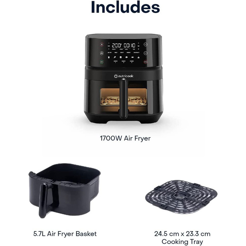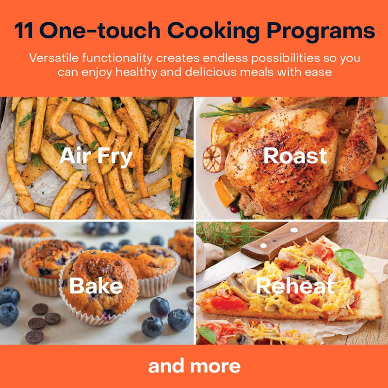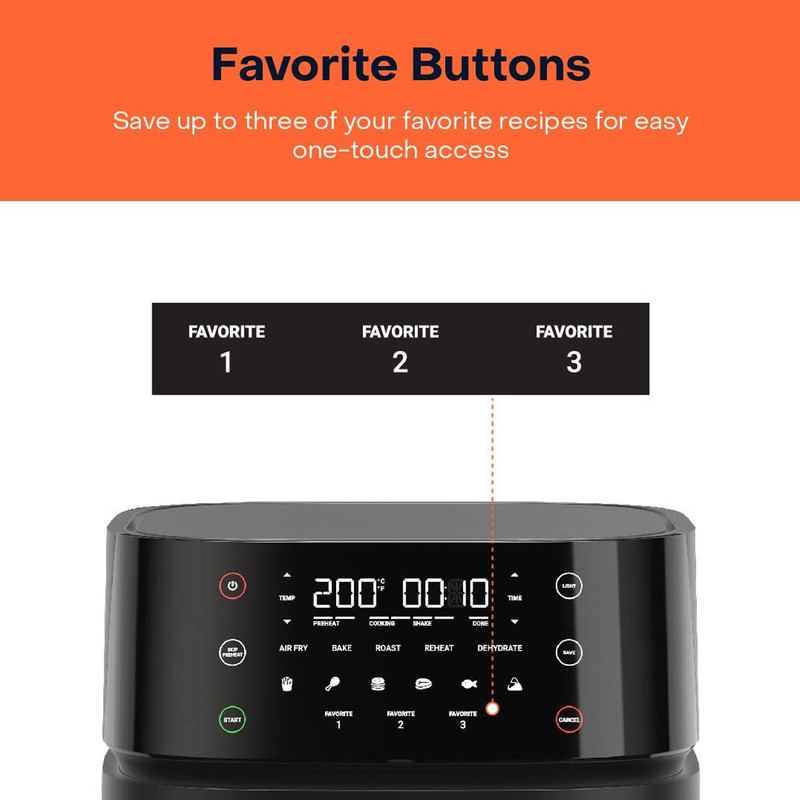 - سایر توضیحات: ظرفیت 5.7 لیتر – مناسب تا 1.4 کیلوگرم سیب زمینی سرخ شده یا 1.2 کیلوگرم مرغ کامل، مناسب برای کل خانواده / میزان تولید صدا 55 دسی بل (کمترین در بین سرخ کن های بازار) / 11 برنامه پخت و پز ( دارای 5 برنامه اصلی پخت – سرخ کردن با هوا، کباب کردن، پخت، آبگیری (میوه خشک کن)، گرم کردن مجدد و 6 برنامه آماده پیش تنظیم – سیب زمینی سرخ شده، مرغ، برگر، استیک، ماهی، سمبوسه ) / دکمه های Favorite به شما امکان می دهد تنظیمات 3 دستور غذای مورد علاقه خود را برای دسترسی سریع تر ذخیره کنید / پخت و پز بی صدا – با سطح سر و صدای 55 دسی بل، از اکثر سرخ کن ها بی صداتر است، بنابراین می توانید با آرامش آشپزی کنید
