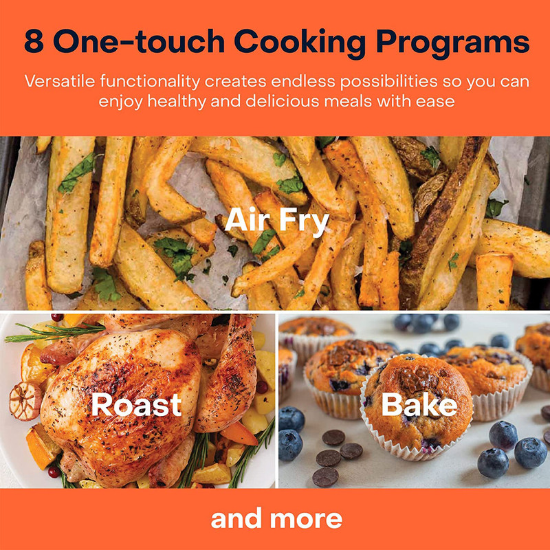 - سایر توضیحات: ظرفیت سبد 3.3 لیتر / دارای 8 برنامه پخت و پز شامل ( 4 برنامه اصلی – سرخ کردن با هوا، پخت، برشته و گرم کردن و 4 برنامه از پیش تنظیم شده – سیب زمینی سرخ کرده، مرغ، برگر و استیک ) / سبد هواپز نچسب و سینی پخت و پز فاقد PFOA/BPA هستند و قابل شستشو در ماشین ظرفشویی که به سرعت و آسانی تمیز می شوند .