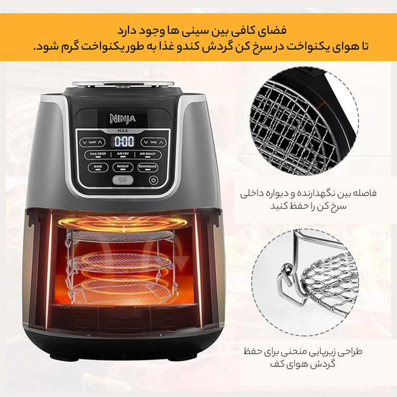 سرخکننده هوای Ninja هوای فوقالعاده داغ را در اطراف غذا به گردش در میآورد تا رطوبت را از سطح آن حذف کند و رنگ قهوهای طلایی و ترد را به آن بدهد.