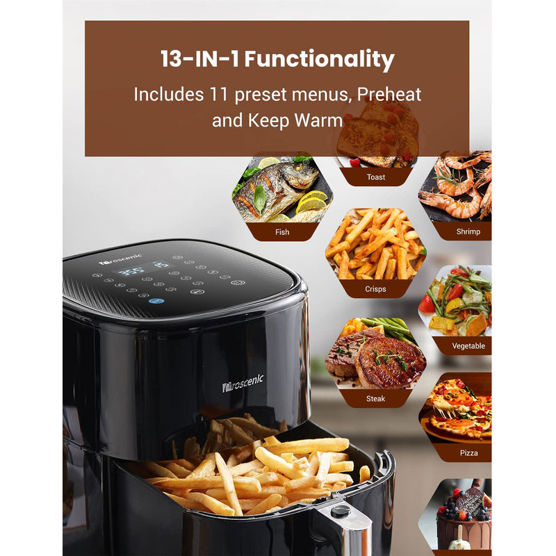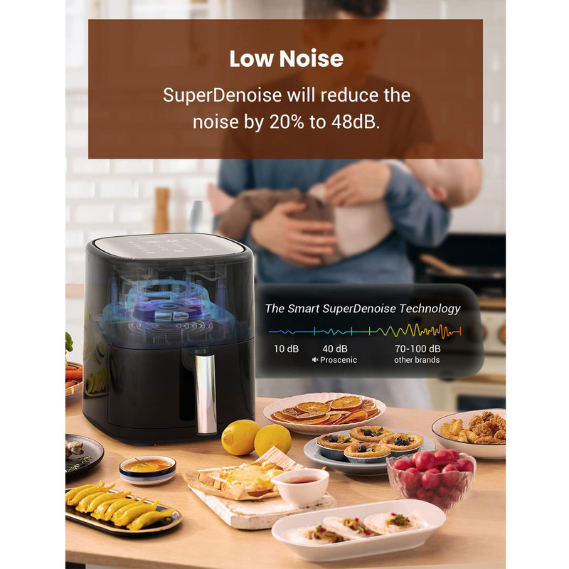 دارای فناوری TurboAir که فناوری TurboAir هفت برابر موثرتر از فناوری گردش هوای معمولی است / کنترل برنامه و دستور العمل های آنلاین با استفاده از برنامه Proscenic، می توانید به راحتی سرخ کن خود را کنترل کنید، فرآیند پخت و پز را برنامه ریزی و نظارت کنید. همچنین می توانید دستور العمل های خود را در برنامه ایجاد کرده و به اشتراک بگذارید / فناوری هوشمند SuperDenoise صدای رایج را تا 20 درصد کاهش می دهد / دارای 13 برنامه پیش فرض سیب زمینی سرخ کرده، مرغ، استیک، سبزیجات، ماهی، میگو، پیتزا، بیکن، حلقه های پیاز، کیک، نان تست و پیش گرم کردن و گرم نگه داشتن / سبد سرخ کن T22 از مواد ایمن برای مواد غذایی که فاقد BPA و PFOA هستند ساخته /