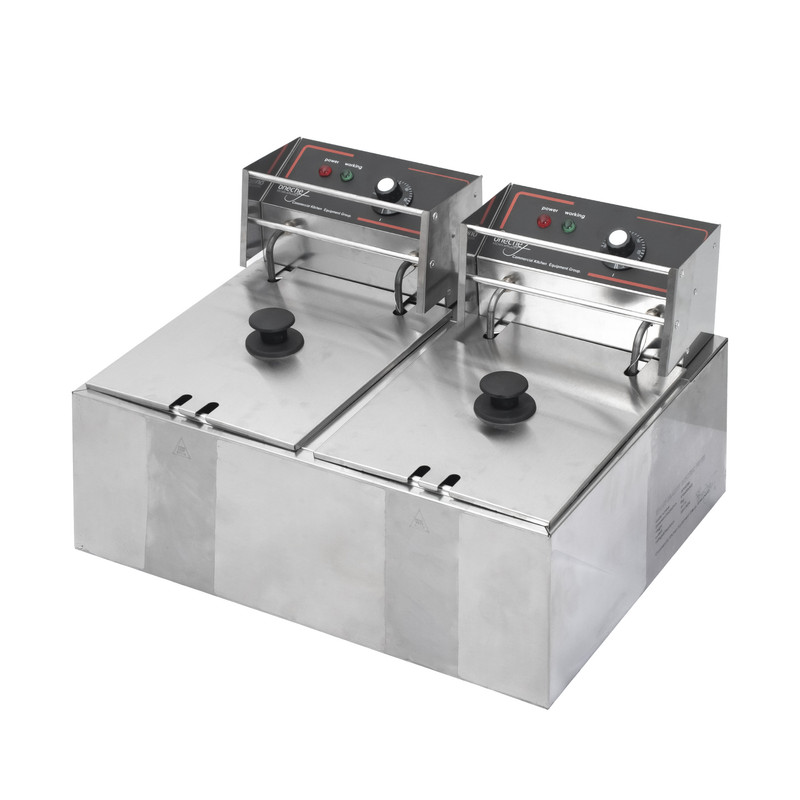 سرخ کن دو مخزن برقی وان شف با حجم هر مخزن 8 لیتر روغن و قدرت هر المنت 2500 وات و دارای ابعاد57x42x37 به شما امکان استفاده در آشپزخانه های کافی شاپ،رستوران و فست فود را می دهد این سرخ کن از جنس استنلس استیل و دارای ترموستات که جهت جلوگیری از سوختن روغن میباشد ترموستات این دستگاه قبلیت تنظیم دما تا 300 درجه سانتیگراد را دارد باید توجه داشت در هنگام استفاده از دستگاه از برخورد دست با بدنه دستگاه خودداری شود چرا که بدنه دستگاه داغ میشود .