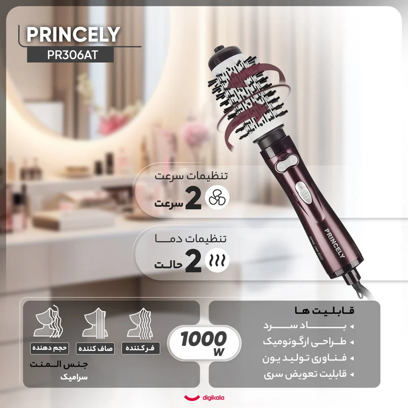 برای صاف کردن موها میتوان از اتو مو استفاده کرد. اگر برای حالتدار کردن موها به وسیلهای نیاز داشته باشیم نیز میتوان اتوموی باریک را به کار برد اما بهترین وسیله برای این کار استفاده کردن از یک حالتدهندهی مو است. حالتدهندهی PR306AT تولید شده توسط «پرینسلی» (Princely)، 2 سری متفاوت برای حالتدار کردن موها دارد. یکی از این سریها 35 میلیمتر و دیگری 50 میلیمتر است و برای ایجاد فرهای درشت و ریز به کار میروند. برای حالتدار کردن موها باید بنا بر سلیقه یکی از سریها را روی دستگاه قرار داد موها را به دور آن تاباند و پس از آن دکمهی روی دستگاه را زد تا روشن شود. با خروج هوای داغ، موها به مرور حالت میگیرند. روی بدنهی دستگاه به غیر از دکمهی خاموش/روشن، دکمهی حرکت سری دستگاه نیز وجود دارد. با زدن دکمهی حرکت سری، سری آن در دو جهت حرکت میکند و با استفاده از این قابلیت میتوان موها در دو جهت حالتدار کرد. جنس المنتهای این سشوار که موها در تماس با آن هستند، سرامیک است. اما باید گفت صفحههای سرامیکی برای سلامتی مو مناسبتر هستند زیرا الکتریسیته را انتقال نمیدهند و در برابر گرما مقاومت دارند، بنابراین میزان انتقال الکتریسیته به مو و ایجاد خطر به هنگام استفاده از سشوار کردن کاهش مییابد. کفههای سرامیکی به دلیل مقاومت در برابر حرارات، دیرتر فرسوده میشوند و بر همین اساس، عمر بالاتری دارند. همچنین حرارتی که در زیر کفههای سرامیکی ایجاد میشود، به خوبی در سطح سرامیک پخش شده و آن را داغ میکند. همین عامل باعث میشود تا حرارت به طور یکسان در حین سشوار کردن به تمام موها منتقل شود. موتور PR306AT از نوع DC است. موتور DC استفاده شده در این دستگاه در مقایسه با موتوهای AC دارای سرعت خروجی هوا و قدرت کمتری است اما از طرفی کم سروصداتر است. همچنین نسبت به سشوارهای دارای موتور AC مدت زمان کمتری میتواند به صورت ممتد روشن بماند. این ویژگی برای افرادی که میخواهند یک سشوار برای مصارف خانگی داشته، مناسب است. سشوار چرخشی PR306AT دارای 2 سری کوچک و بزرگ، موتور نوع DC، المنت سرامیک و مناسب برای استفادهی خانگی است.