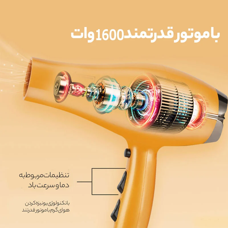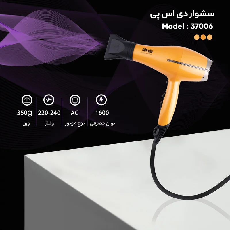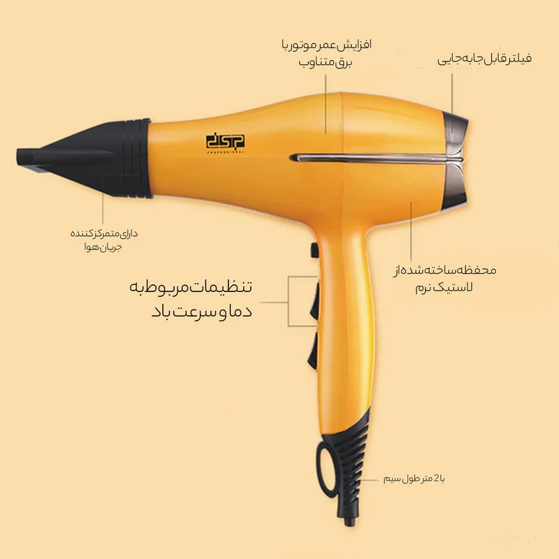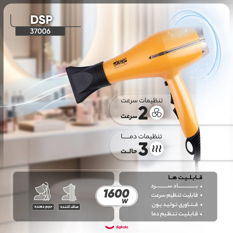 برای داشتن موهایی مرتب و ابریشمی، داشتن یک سشوار قوی و حرفهای لازم است؛ سشوار حرفهای دی اس پی(DSP) مدل 37006، با داشتن موتوری قوی با توان 1600 وات این نیاز را برطرف میکند. موتور این مدل حرفهای در کنار قدرتمندی، صدای کمی تولید میکند که در زمان کوتاهی ظاهری زیبا و آراسته به موهای شما میدهد. سشوار حرفهای دی اس پی مدل 37006، مجهز به سیستم تولید یون است که آسیب کمتری به موها وارد میکند در حالی که خشک شدن موها را تسریع میبخشد. دوعدد متمرکز کننده باد برای ایجاد فشار بیشتر از اقلام همراه این مدل است. سشوار حرفهای دی اس پی مدل 37006 همچنین دارای قابلیت تنظیم سرعت باد و حرارت را در دو حالت مختلف دارد. با فعال کردن باد سرد، المنت به صورت لحظهای از کار میافتد تا شما بتوانید به کمک آن حالتبخشی مو را تثبیت کنید. سشوار حرفهای دی اس پی مدل 37006، سیمی به طول 2.1 متر و حلقه آویزانکننده نیز دارد. بنابراین این سشوار حرفهای با داشتن همه این ویژگیهای خوب در کنار هم، نیاز شما را برای داشتن موهایی همیشه سالم، درخشان و خوشحالت برطرف میکند.