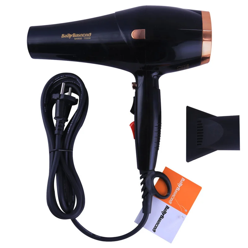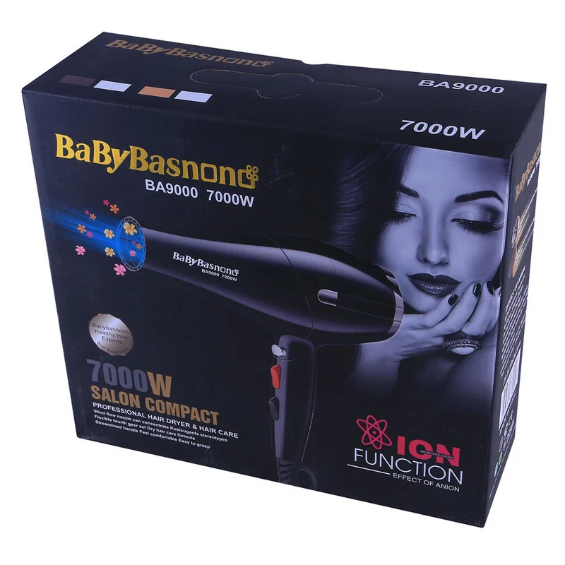 سشوار بیبی باس نانو مدل BA9000 دارای موتور AC با توان 7000 وات است. المنت به کار رفته در این سشوار از جنس پیشرفته بوده و باعث میشود تا موها ظاهر ابریشمی و لطیف پس از خشک کردن داشته باشند. موتور سشوار بیبی باس نانو AC بوده و در کنار قدرت فوق العادهای که دارد صدای زیادی را نیز تولید نمیکند و به وسیله آن میتوانید موهای خود را خیلی سریع خشک و حالت دهی کنید. شما میتوانید سرعت باد سشوار را در دو حالت و حرارت آن را هم در دو حالت متفاوت تنظیم کنید. با فعال کردن باد سرد المنت به صورت لحظهای از کار میافتد تا شما بتوانید به کمک آن حالت بخشی از مو را تثبیت کنید. همراه این سشوار 2 عدد متمرکز کننده برای ایجاد فشار بیشتر ارائه شده است. گفتنی است فیلتر هوای سشوار را میتوان از آن جدا و تمیز کنید. همچنین این سشوار دارای چراغ روشنگر LED بوده و مجهز به سیستم تولید یون نیز است که باعث میشود مو با سرعت بیشتری خشک شود و در نتیجه آسیب کمتری به مو وارد میشود. به دلیل بلند بودن کابل این سشوار که در حدود 2.1 متر است، برای استفاده در سالنهای آرایشی بسیار مناسب بوده و روی دسته آن نیز حلقهای جهت آویزان کردن آن وجود دارد.