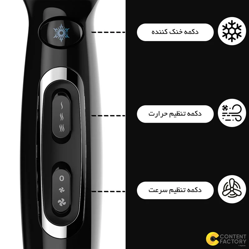 سشوار «رمینگتون» (Remington) مدل «AC5999» یک سشوار حرفهای با موتور 2300 وات AC و فناوری تولید یون است. موتور سشوار از نوع AC است و نسبتبه بسیاری از سشوارهای DC عمر بیشتری میکند. علاوهبر این توان این موتور 2300 وات است و باد را با سرعت 130 کیلومتر در ساعت به بیرون پرتاب میکند. همهی اینها از AC5999 یک سشوار حرفهای برای خشککردن سریع و دادن حالت دلخواه به موها ساخته است. Remington AC5999 به فناوری تولید یون مجهز شده است. طبق گفتهی شرکت سازنده این سشوار تا 90 درصد از وز شدگی موها کم میکند و باعث میشود ظاهر موها درخشانتر بهنظر برسد. این مدل نسبت به میانگین سشوارهای دیگر وزن کمتری دارد و میتوان بهآسانی سشوار را در یک دست و برس را در دست دیگر گرفت. AC5999 دو متمرکزکننده دارد که یکی از آنها باریکتر است و باد را با فشار بیشتری به بیرون هدایت میکند. علاوهبر این یک دیسپانسر برای حجمدادن و ایجاد موج در موها همراه سشوار ارائه شده است. دو حالت سرعت و سه حالت دما برای سشوار وجود دارد که باتوجه به جنس مو و استفادهی موردنظر باید یکی از آنها را انتخاب کرد. در بالای دسته دکمهی باد سرد قرار دارد که برای سردکردن سریع باد و تثبیت حالت بخشی از موها استفاده میشود. فیلتر هوای سشوار از آن جدا میشود و میتوان هرچند وقت یکبار گردوغبار روی آن را تمیز کرد تا قدرت باد حفظ شود. سیم برق سه متر طول دارد و در محل اتصال به بدنه دارای حلقهای برای آویزان کردن سشوار است. بهطورخلاصه، سشوار رمینگتون مدل AC5999 دارای موتور 2300 وات AC، فناوری تولید یون، وزن کم، متمرکزکننده و دیسپانسر، دو حالت سرعت و سه حالت دما، دکمهی باد سرد، سیم بلند و حلقهی آویختن است.