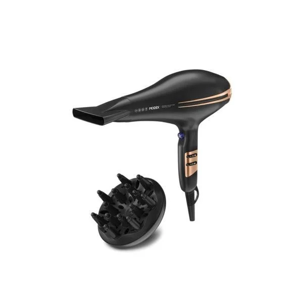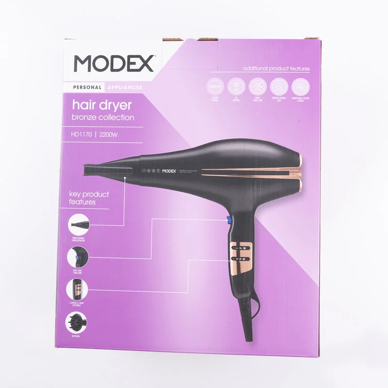 کمپانی مودکس یکی از بیرقیبترین شرکتها در زمینه تولید لوازم برقی خانگی و شخصی در سطح بین المللی است که خاستگاه آن کشور انگلستان و شهر لندن است. تمامی محصولات این برند از لحاظ کیفیت و کارایی در رده بهترینها قرار دارند؛ چرا که سازندگان این برند توجه ویژهای به کیفیت کالاهای خود داشته و بهترین ناظران را برای نظارت بر کیفیت تولید گماشتهاند. علاوه بر این، کمپانی مودکس تاکید ویژهای روی زیبایی طراحی ظاهری محصولات خود و استفاده آسان و راحت آنها دارد. سشوار مودکس مدل HD1170 یکی از محصولات کمپانی مودکس است که بسیار قوی با توان 2200 وات بوده و موتور آن از نوع AC است که به صورت حرفهای، نیمه حرفهای و خانگی کاربرد دارد. داشتن قابلیت Thermo protect از دیگر ویژگیهای خاص این مدل است که Thermo protect از گرم شدن بیش از حد آن جلوگیری میکند چرا که در اثر گرم شدن بیش از حد، علاوه بر آسیب به مو، به خود دستگاه نیز آسیب وارد میشود. سشوار مودکس مدل HD1170 همچنین دارای دو حالت تنظیم سرعت و سه حالت دمایی مختلف است که به کمک دکمههایی که روی دسته آن تعبیه شده، قابل تغیر است؛ یعنی در مجموع شما میتوانید در شش حالت مختلف تنظیم سرعت و دما، از آن بهره ببرید که با توجه به نوع نیاز شما و جنس موی شما تغیر میکند. این مدل دارای دکمه باد سرد نیز است؛ قابلیتی که باعث حفظ حالت موها شده و به لطافت و نرمی آنها کمک میکند. این سشوار در قسمت انتهایی خود دارای حلقه آویز است. با داشتن این سشوار دیگر هرگز نگران هیچگونه آسیبی به موهایتان در مورد سشوار کردن نباشید چرا که سشوار مودکس مدل HD1170 مجهز به فناوری تولید یون است که با خنثی کردن یونهای مثبت ایجاد شده بر سطح مو، از ایجاد الکتریسیته ساکن در سطح موها جلوگیری کرده و با حفظ رطوبت ساقه مو، آنها را سشوار میکند که این ویژگی از ایجاد موخوره، خشک شدن و وز شدن موها جلوگیری میکند.