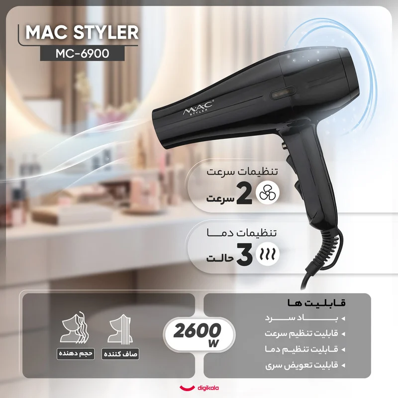 سشوار حرفهای مک استایلر مدل MC-6900 یک انتخاب ایدهآل برای کسانی است که به دنبال ابزاری قدرتمند و کارآمد برای آرایش موهای خود هستند. با توان مصرفی 2600 وات و موتور AC قوی، این سشوار به سرعت و به طور مؤثر موها را خشک کرده و به آنها حالتی دلخواه میبخشد. وزن 810 گرمی آن، استفاده طولانیمدت را آسانتر کرده و طراحی ارگونومیک آن به شما کنترل بیشتری در حین استفاده میدهد. این سشوار دارای سه حالت دما و دو سرعت مختلف است که به شما این امکان را میدهد تا با توجه به نوع مو و نیاز خود، بهترین تنظیمات را انتخاب کنید. اقلام همراه شامل دیسپانسر و متمرکز کننده باریک است که به شما کمک میکند حرارت را به صورت متمرکز بر روی نقاط خاصی از موها اعمال کنید و به راحتی موها را صاف یا حجم دهید. همچنین، قابلیت باد سرد به تثبیت حالت موها کمک کرده و از خشکی آنها جلوگیری میکند. جنس المنت سرامیک نیز به توزیع یکنواخت حرارت و حفظ رطوبت طبیعی موها کمک میکند. با سشوار مک استایلر مدل MC-6900، شما میتوانید تجربهای حرفهای و لذتبخش از آرایش موهای خود داشته باشید و به ظاهری زیبا و درخشان دست یابید.