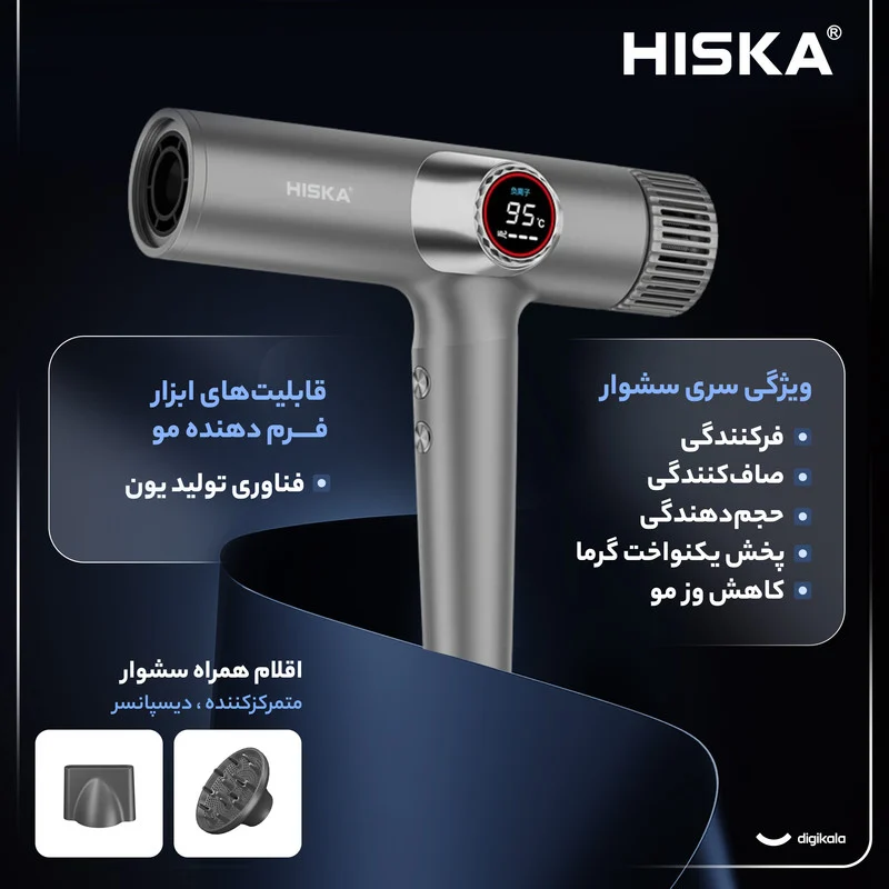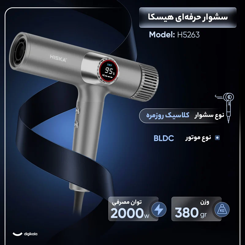 سشوار مدل H5263 از برند هیسکا ترکیبی از قدرت، هوشمندی و طراحی نوآورانه است و برای استفاده روزمره یا حرفهای ایدهآل است. این دستگاه با توان ۲۰۰۰ وات و موتور پرقدرت BLDC با سرعت ۱۱۰ هزار دور در دقیقه، هوای یکنواخت و پرفشار تولید میکند تا موها در کمترین زمان خشک شده و از آنها مراقبت شود. نمایشگر گرد LCD ظاهر مدرن و کاربری آسانی به دستگاه بخشیده است. امکان تغییر دما از سرد به گرم تنها با یک دکمه و وجود ۹ حالت کاری شامل سه سطح دما (سرد، گرم، داغ) و سه سطح سرعت (کم، متوسط، زیاد) تجربه استفاده را انعطافپذیر میکند. حالت گردش خودکار دمای هوا بر اساس کیفیت مو و پوست سر، عملکرد هوشمندانه دستگاه در مراقبت از مو را افزایش میدهد. عملکرد خاموشی خودکار پس از ۱۰ ثانیه و قابلیت پاکسازی خودکار توری ورودی هوا ایمنی و نگهداری دستگاه را ارتقاء میدهد. فناوری تنظیم دمای هوشمند از آسیب مو جلوگیری میکند و طراحی کاهش نویز، صدای تولیدی را در سطح مطلوب نگه میدارد. فناوری یونی قدرتمند با تولید ۶۰۰ میلیون یون منفی در هر سانتیمتر مکعب، از ایجاد الکتریسیته ساکن جلوگیری کرده و نرمی، لطافت و درخشندگی طبیعی موها را حفظ میکند. ورودی هوای روی دسته مانع مکش تصادفی مو میشود و نازل و دیفیوزر مغناطیسی تنوع حالتدهی و راحتی استفاده را افزایش میدهند. سشوار با طول کابل ۳ متری آزادی حرکت خوبی فراهم میکند و بدنه مقاوم از جنس پلاستیک PC با وزن سبک ۳۸۰ گرم، استفاده طولانیمدت را بدون خستگی امکانپذیر میسازد. در مجموع، هیسکا مدل H5263 ترکیبی از قدرت صنعتی، دقت دیجیتال و مراقبت هوشمند از مو است و هم برای نیازهای روزمره و هم استفاده حرفهای در آرایشگاهها مناسب است.