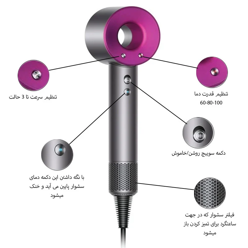 این سشوار دارای سه تنظیم دقیق دما 100-80-60درجه و تنظیم باد سرد با نگه داشتن دکمه تعبیه شده روی دستگاه است