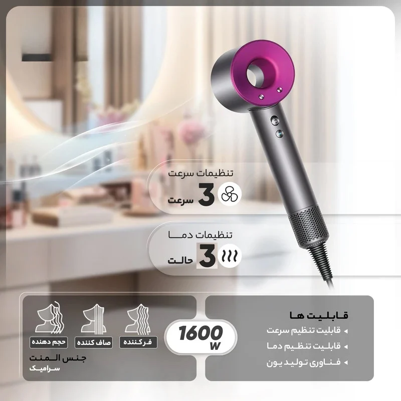 • سایر مشخصات: این سشوار دارای سه تنظیم دقیق دما 100-80-60درجه و تنظیم باد سرد با نگه داشتن دکمه تعبیه شده روی دستگاه است