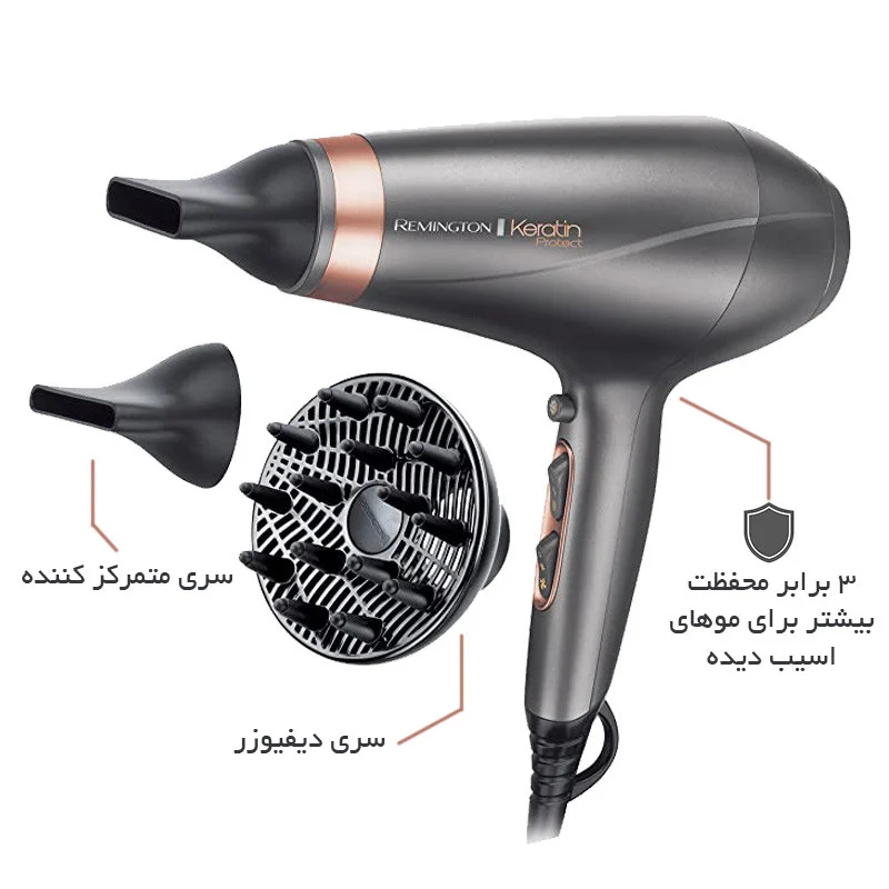 سشوار یکی از محبوبترین ابزارهای آراسته کردن موی سر است که افراد زیادی عادت به استفاده روزانه آن دارند. سشوار رمینگتون مدل AC8820 دستگاهی پرقدرت با توان کاکرد بالاست که به طور کلی برای استفادهی خانگی و نیمه حرفهای طراحی شده است. موتور دستگاه از نوع AC است و با حداکثر قدرت 2200 وات کار میکند. از مزایای بزرگ این سشوار میتوان به قابلیت تولید یون توسط آن اشاره کرد. این ویژگی باعث میشود میزان وزشدن موها به حداقل برسد. سشوار AC8820 قابلیت محافظت کراتین مو را در خود دارد. این سشوار دارای قابلیت ایجاد باد سرد را نیز دارد و طول کابل سشوار به 3 متر میرسد. علاوه بر این، میتوانید دمای هوای خروجی سشوار را در سه وضعیت و سرعت باد آن را دو حالت تنظیم کنید. دستگاه مدل AC8820 دارای یک سری دیفیوزر است که برای افراد دارای موهای فر بسیار کاربردی است. همچنین 2 سری که در بستهبندی این محصول وجود دارند هم برای دادن استایل به موی سر بسیار کاربردی هستند.