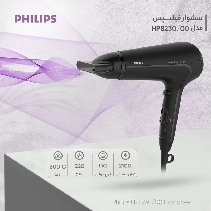سشوارهای خانگی قدرت کمتری نسبت به سشوارهای سالنهای آرایشی دارند و نوع موتور آنها هم متفاوت است. اما بعضی از شرکتها اقدام به تولید سشوارهای خانگی با قدرت موتور بالا کردهاند که مناسب کسانی است که انتظار قدرت بالای پرتاب باد از سشوار خود دارند. مزیت قدرت موتور بالاتر این است که برای خشککردن سریع موها لازم نیست از درجه حرارت بالا استفاده کرد و از آسیب به مو جلوگیری میشود. سشوار فیلیپس (Philips) مدل «HP8230/00» با موتور 2100 واتی از نوع DC، قدرت و سرعت را با هم آمیخته تا خشککردن و حالت دادن به موها سریعتر و راحتتر انجام شود. 6 درجهی قابل تنظیم برای سرعت و دمای باد خروجی وجود دارد که میتوان حالت مناسب را انتخاب کرد. سری متمرکز کنندهی باد سشوار با طراحی باریکی که دارد به خوبی برای هدایت باد سشوار در جهت دلخواه به کار میرود. بعد از ایجاد حالت دلخواه موها میتوان برای تثبیت آن از باد سرد سشوار استفاده کرد. دکمه حالت TP که روی بدنه دیده میشود کمک میکند که دمای باد در حین خشککردن از یک حدی بیشتر نشود و به مو آسیب وارد نیاید. سیم بلند 1.8 متری و حلقهی لاستیکی که در انتهای سشوار برای آویزان کردن آن قرار دارد، امکان استفاده از این مدل را در سالنهای آرایشی ممکن کرده است. فیلتر هوای سشوار قابل جدا شدن است و زمانی که به علت وجود پرز و گردوغبار قدرت باد کم شده باشد بهراحتی میتوان آن را جدا کرده و تمیز کرد. Philips HP8230/00 با موتور 2100 واتی از نوع DC، دارای 6 درجهی تنظیم سرعت و دمای باد، حالت TP و سیم بلند و حلقهی آویزان کردن و فیلتر هوای قابل جدا شدن است.