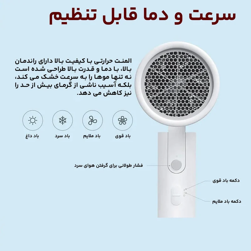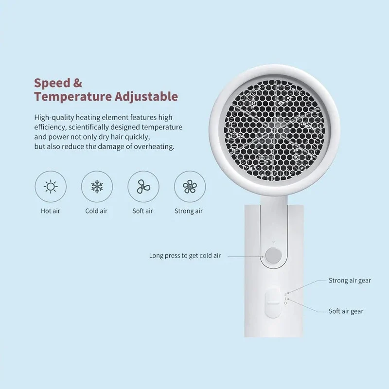 سشوار میجیا شیائومی مدل CMJ02LXW مکانیزم تاشو دارد که برای افراد پر سفر ویژگی مهمی به حساب میآید. بدنه کوچک در کنار ماژول تاشوی این سشوار، طراحی جمع و جور این دستگاه را تشکیل میدهد.