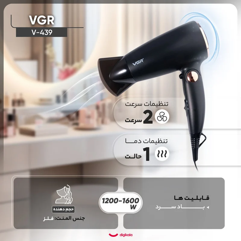 سشوار های مسافرتی به دلیل حجم کم طرفداران زیادی دارند، زیرا حمل و نقل آنها در هر مکانی بسیار راحت و آسان است. با داشتن یک سشوار مسافرتی دیگر نگران زیبایی و حالت موهایتان در سفر نخواهید بود. سشوار مسافرتی وی جی آر مدل V-439 با توان 1600-1200 وات، طراحی و رنگ جذاب، وزن پایین و دسته تاشو می تواند همراه خوبی برای سفرهای شما باشد و به خوبی از عهده خشک کردن موهای شما برآید. سشوار از منبع تغذیه با ولتاژ220-110 ولت و 50 هرتز استفاده می کند و دارای دو تنظیم سرعت و دکمه هوای سرد است که شما می توانید با توجه به عادت های شخصی و جنس موی خود، تنظیم مناسب را انتخاب کنید. این سشوار همچنین دارای قابلیت محافظت در برابر گرمایش بیش از حد است که باعث میشود در صورت بالا رفتن دمای دستگاه، به طور خودکار خاموش شود و از آسیب دیدن سشوار و موهای شما پیشگیری کند. طول کابل سشوار 1.8 متر است که به شما امکان میدهد که با راحتی در فضای مورد نظر خود از آن استفاده کنید. حلقه آویز این سشوار به شما کمک میکند که آن را در جای مناسب قرار دهید و از آن مراقبت کنید. سری متمرکزکننده این سشوار نیز به شما این امکان را میدهد که هوای گرم را به نقاط دقیق موهای خود هدایت کنید و حالت مطلوب را به آنها بدهید. برای عمر بیشتر سشوار توصیه می شود در حمام و مکان های مرطوب از آن استفاده نکنید، خروجی مکش هوا و خروجی هوای سشوار را مسدود نکنید و توری خروجی مکش را تمیز نگه دارید.