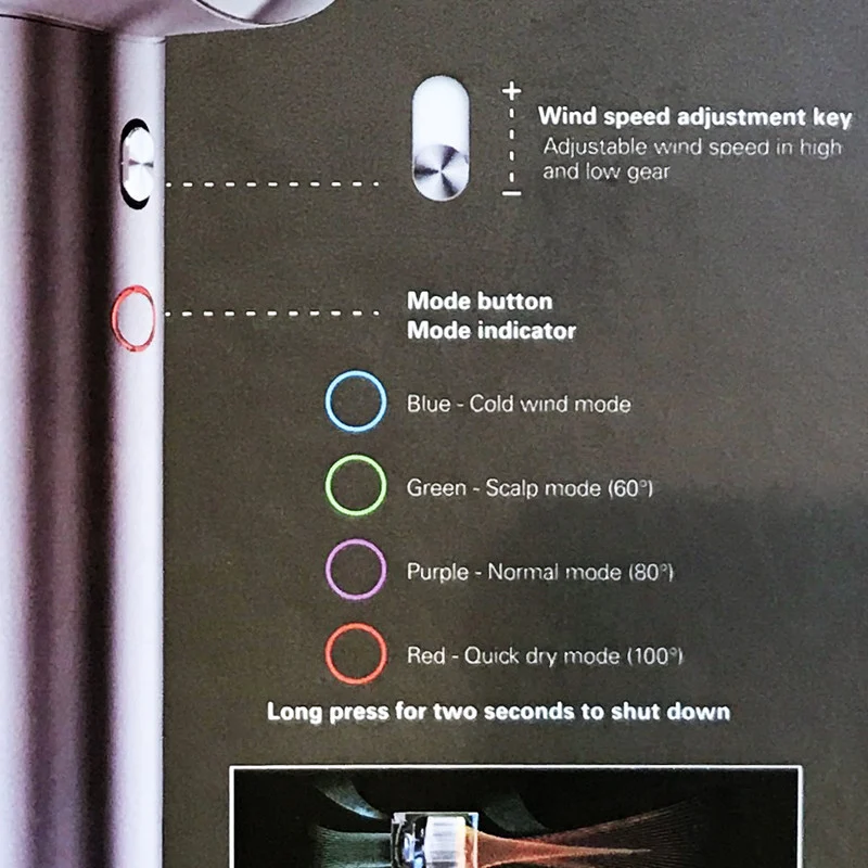 تنظیم دما تنها با یک دکمه تنظیم 3 حالت گرما و یک حالت سرما و یک دکمه برای تنظیم شدت کم و زیاد باد است