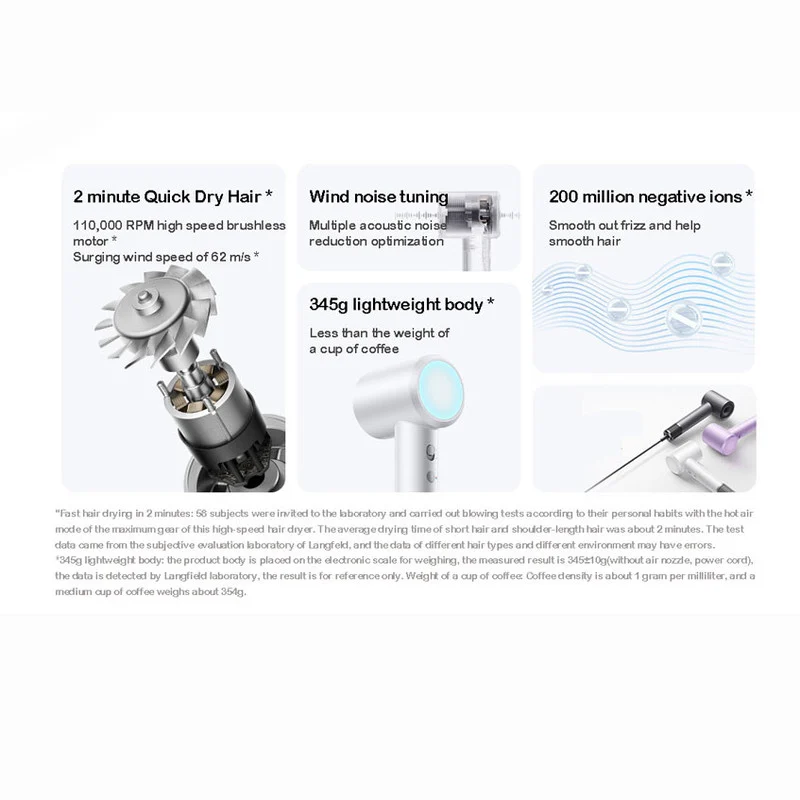 این سشوار دارای موتور براشلس 110000 دور در دقیقه با 7 خروجی هوای فوق العاده بلند است. این دستگاه به سرعت جریان هوای قوی تا 62 متر بر ثانیه ایجاد می کند که از نظر عملکرد از سشوارهای قبلی MIJIA برتری دارد. سشوار دارای دمای ثابت 57 درجه سانتیگراد و فناوری خشک کردن با سرعت باد بالا است. این اجازه می دهد تا موها در دمای راحت تر خشک شوند و محافظت از پوست سر و مو را تضمین می کنند.