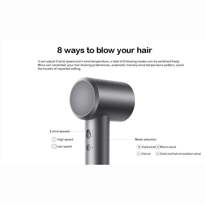 سشوار پرسرعت MIJIA H501 حدود 200 میلیون یون منفی با غلظت بالا تولید می کند که می تواند به سرعت هرگونه الکتریسیته ساکن موجود در مو را خنثی کند و همچنین موخوره و فر شدن مو را کاهش دهد. دو گزینه سرعت باد با سشوار MIJIA به اضافه چهار گزینه دمای باد و هشت روش دمیدن در دسترس است.