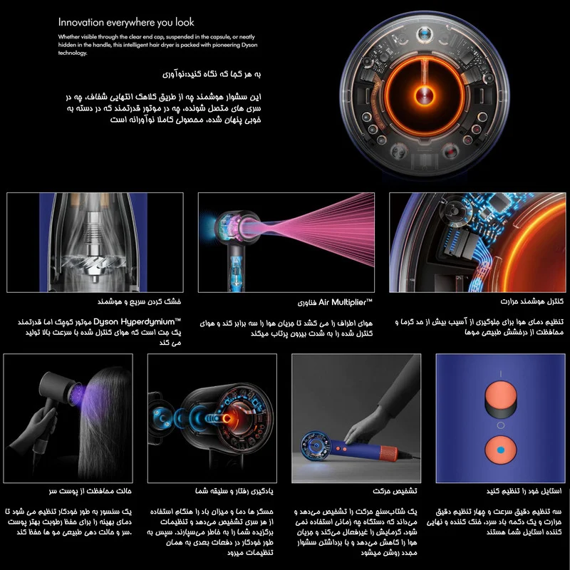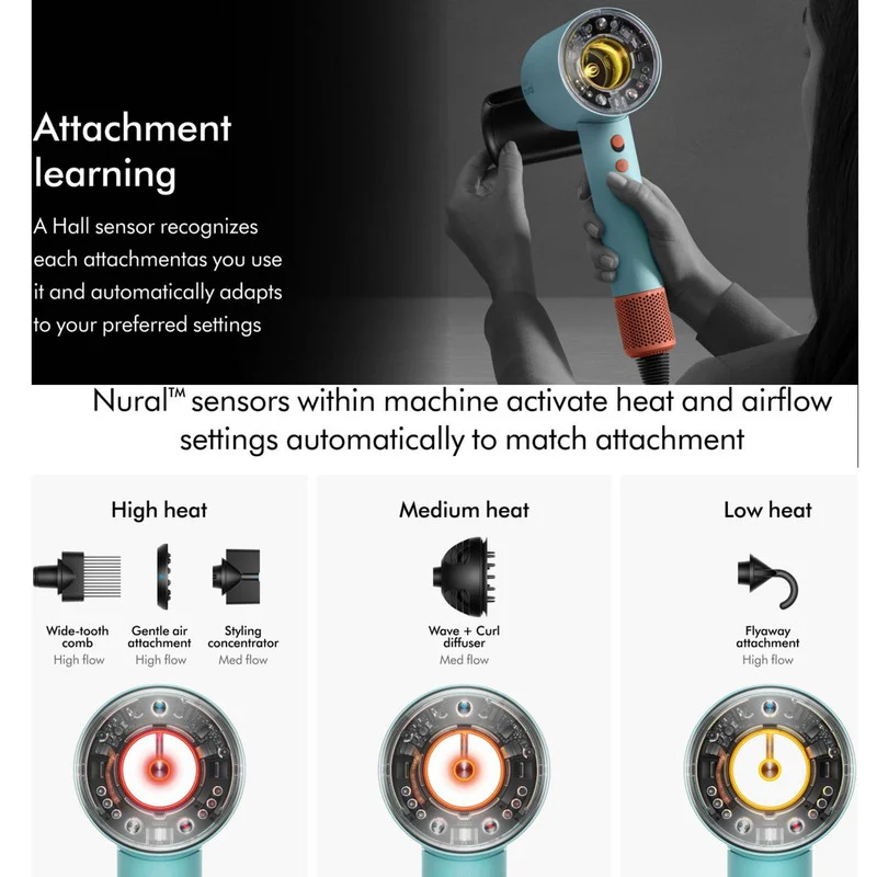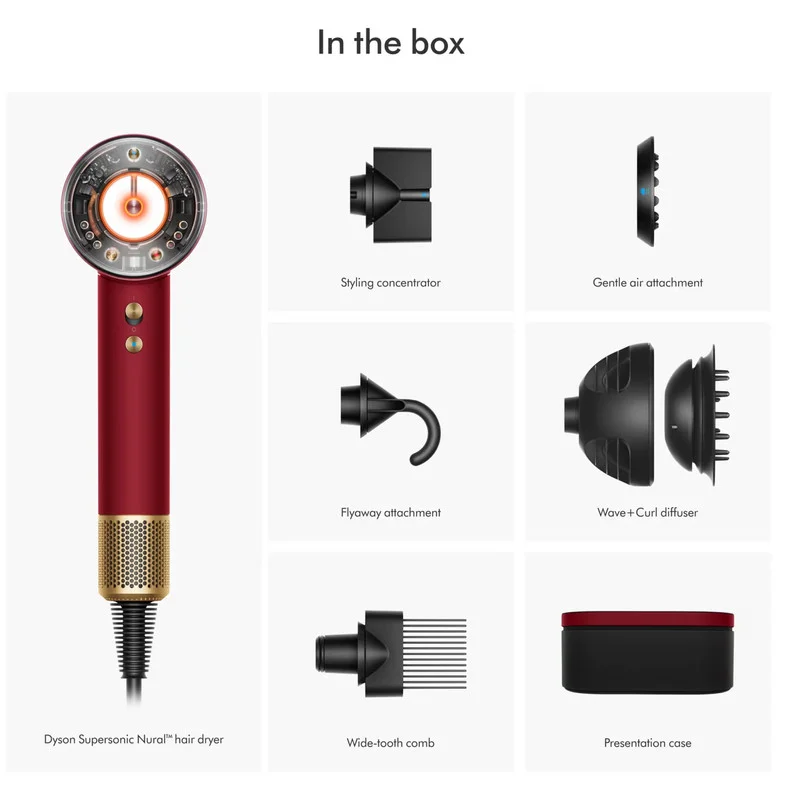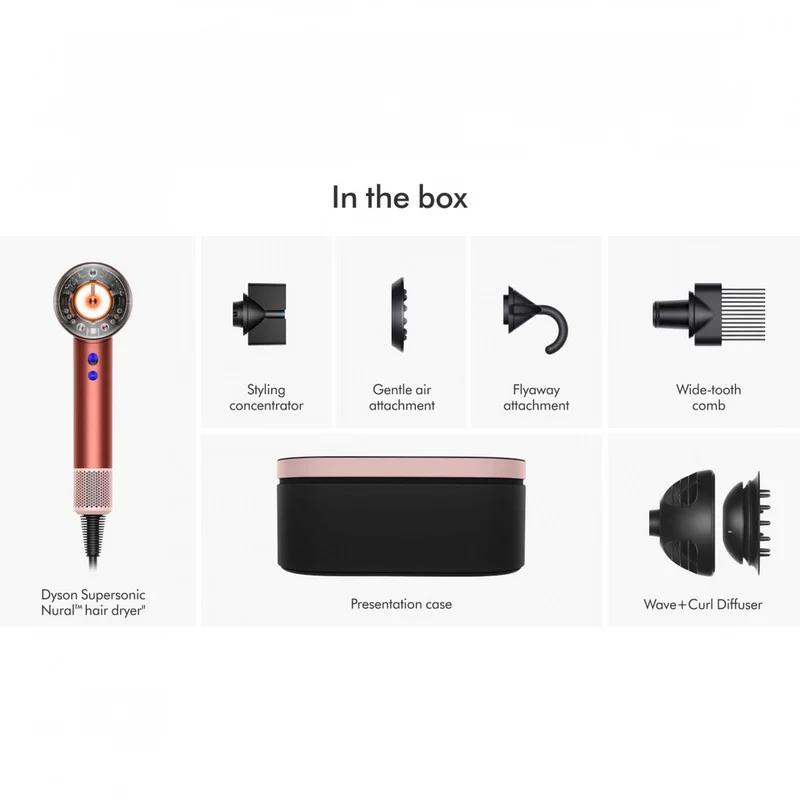 سشوار دایسون مدل Supersonic nural یکی از محصولات این برند بوده که با با فناوری سریع و هوشمند بدون گرمای شدید، یک جت هوای کنترل شده با فشار بالا و سرعت بالا برای خشک کردن سریع مو ایجاد میکند. این سشوار دارای پنج سری مختلف جهت کاربردهای متفاوت است که برای حالت دادن و خشک کردن مو استفاده میشود. از جمله آنها سری مدل Wave+Curl diffuser جدید دایسون که در دو حالت مواج و فر موهای مجعد را در حالتی بسیار طبیعی خشک می نماید می توان اشاره کرد.این سشوار برای انواع مو از جمله موهای فر و حالتدار و همچنین صاف و لخت قابل استفاده است و هیچ گونه آسیبی به موهای شما نمیزند.