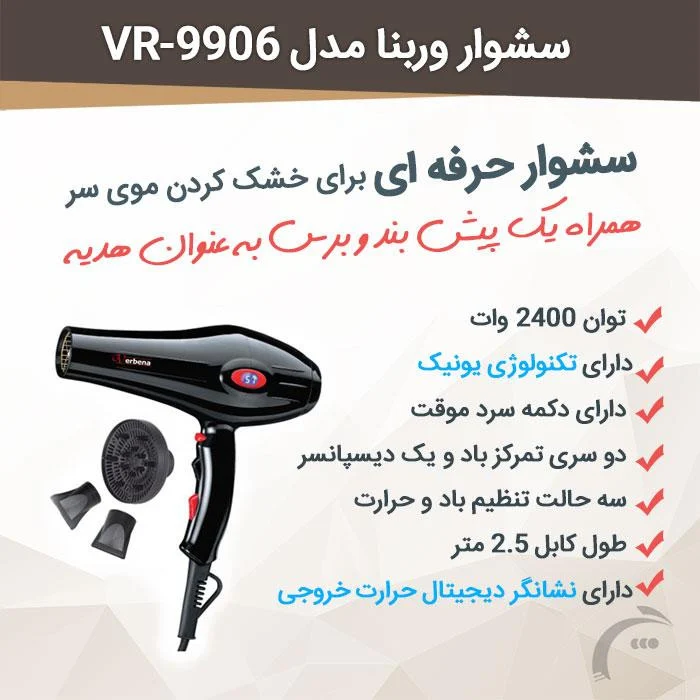آراستگی و خوشحالت بودن موی سر، دغدغه مهم بانوان و آقایان بسیاری است. به همین دلیل استفاده از ابزارهای خوشحالت کردن موی سر مانند سشوار، اتو موی، بیگودی، برس حرارتی و… بسیار مرسوم است. در این میان اما استفاده از سشوار از مابقی ابزارها بسیار راحتتر و پرکاربردیتر است. سشوار وربنا مدل 9906 یک سشوار بسیار خوشدست و حرفهای است. شما میتوانید از این سشوار برای موارد مصرفی خانگی، نیمه حرفهای و حرفهای استفاده کنید چرا که پاسخگوی نیازهای شما در هر سطحی است. توان مصرفی مدل 9906، 2400 وات بوده که به واسطه همین توان، قدرت خوبی برای پرتاپ باد دارد. همچنین جنس المنت به کار رفته در این محصول از نوع سرامیک تورمالین و نوع موتور آن AC است. این محصول علاوه بر سری دیسپانسر، یک بورس نسوز نیز دارد. در آخر باید گفت طول سیم این سشوار 2.5 متر است که این مقدار کار شما را حتی اگر پریز برق دورتر از آینه باشد؛ راحت میکند.
