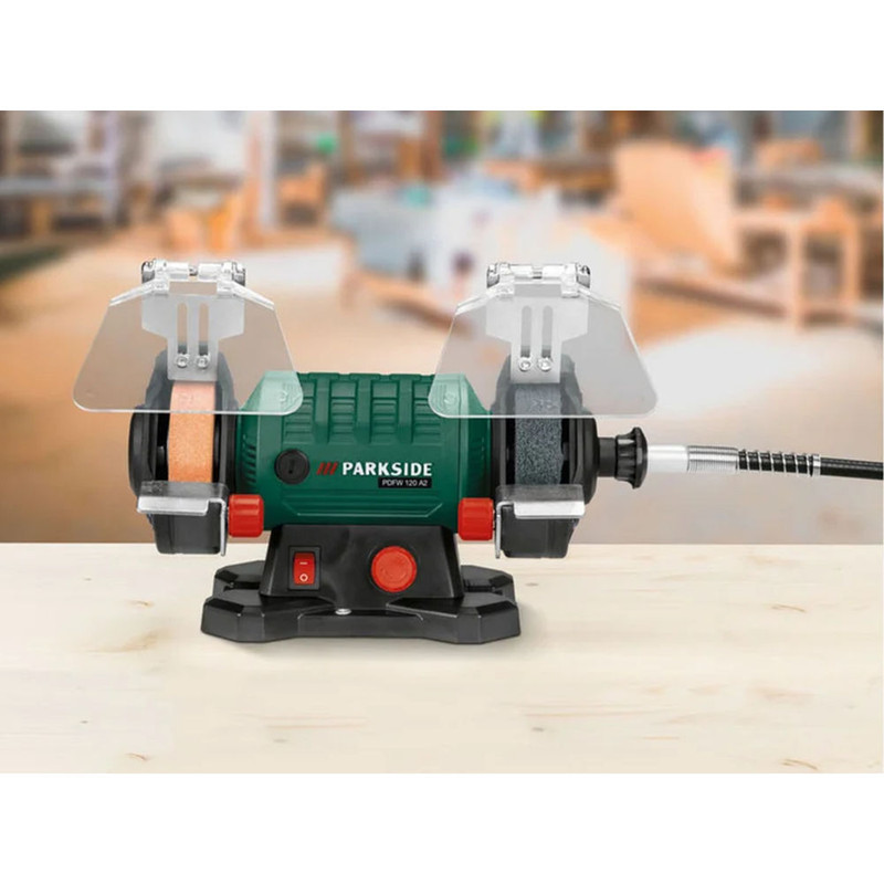 سنگ رومیزی و فرز مینیاتوری پارکساید ابزاری دوکاره و عالی لازم برای کار های ریز و دقیق می باشد. سنگ رومیزی و فرز مینیاتوری پارکساید ( چرخ سنباده ) قدرتی معادل 120 وات به شما می دهد. همچنین دارای 103 قطعه جانبی می باشد که اکثر کارهای شما را پشتیبانی می کند. همچنین دستگاه دارای دیمر 6 حالته میباشد که امکان کنترل سرعت دستگاه از 0 تا 11500 دور بر دقیقه را دارید. شما با خرطومی که همراه دستگاه میباشد میتوانید از فرز مینیاتوری دستگاه استفاده کرده و روی کوچکترین قطعات با دقت عملیات تراش و صیقل زدن را اجرا کنید.