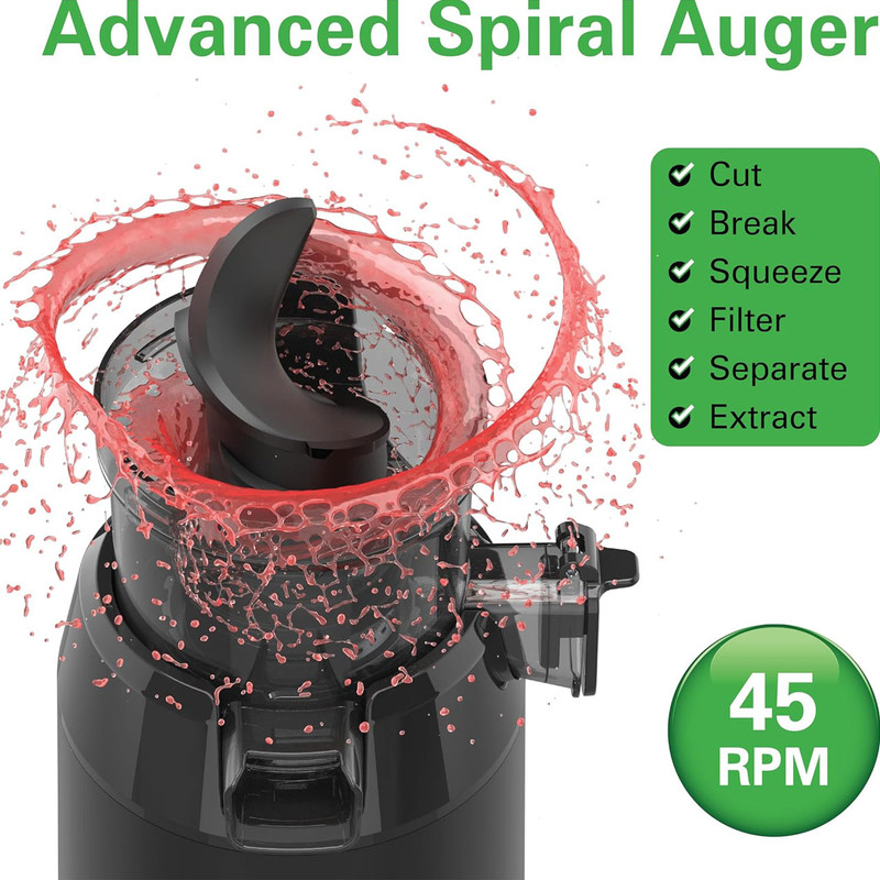 | امکانات و قابلیتها | فن آوری فشار آهسته با سرعت ملایم 45 دور در دقیقه کار می کند و از فشار دادن دست تقلید می کند تا طعم طبیعی، طراوت و مواد مغذی آب میوه شما را حفظ کند. از آبمیوه باکیفیت که مدت بیشتری تازه می ماند لذت ببرید / دارای موتور قدرتمند / قابلیت تمیز کاری آسان / دارای موتور بی صدا / تک سرعته دارای حالت چرخش معکوس |