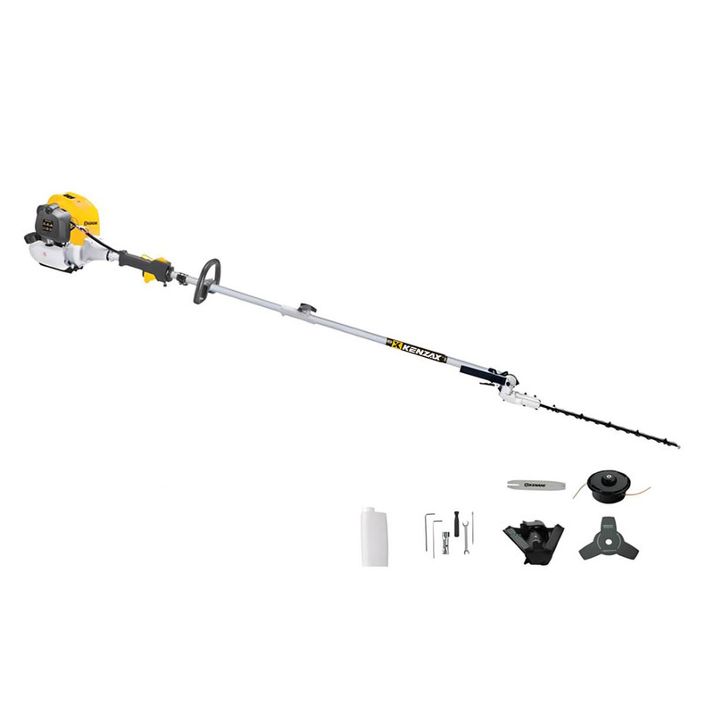 تیغه فلزی سهدندانه برای برش علفهای ضخیم، تیغه برش نایلونی برای چمنزنی و برشهای سبک، اره زنجیری (شاخهزن) برای برش شاخهها و تنههای نازک و شمشادزن برای فرمدهی و مرتبسازی بوتهها و پرچینها است.