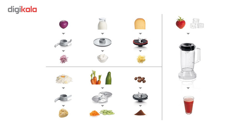 غذاساز «بوش» مدل «MCM3501M» یکی از دستگاههای باکیفیت ارائهشده در بازار است. این غذاساز چندکاره، بدنهی اصلی دارد که ترکیبی از پلاستیک و استیل برسخورده است که موتور قدرتمند داخل آن قرار گرفته است. بدنه با ترکیب رنگهای روشن و تیره، زیبایی خاصی دارد که روی طراحی آشپزخانه هم تاثیر میگذارد. روی دستگاه، پیچ تنظیم سرعت و روشن و خاموش دستگاه تعبیه شده است که از حالت پالس یا لحظهای هم پشتیبانی میکند. این پیچ به صورت الکترونیکی تنظیم نمیشود و مانند مدلهای معمولی، تنظیم پلهای دارد. در بالای بدنهی اصلی، ظرف خردکن متصل میشود تا با اتصال تیغهها و دیسکهای رندهی مختلف، عملکردهای متفاوتی مثل ریزکردن، خردکردن، رنده در اشکال مختلف و حتی قابلیت خمیرزن در دستگاه مشاهده شود. پارچ مخلوطکن هم در غذاساز بوش مدل MCM3501M با ظرفیت یک لیتر وجود دارد تا بتوان مخلوطهای مایع و آبمیوه و اسموتیهای متنوع را تهیه کرد. آسیاب کوچک همراه دستگاه برای تهیهی پودر ادویه، زعفران و مغز آجیل استفاده میشود تا به غذاها اضافه شوند. این دستگاه قابلیت گرفتن آب مرکبات هم دارد تا آبپرتقال طبیعی و سالم بهراحتی تهیه و صرف شود. همچنین قطعات مختلف دستگاه قابلشستوشو در ماشین ظرفشویی هستند. زیر بدنه، پایههای ضدلغزش در نظر گرفته شدهاند تا حین روشنبودن، مانع از تکانخوردن دستگاه شوند. توان بالای موتور، ظرفیت مناسب ظروف و تنوع لوازم جانبی، این غذاساز را دستگاهی منحصربهفرد کرده است. بوش تولیدکننده و عرضهکنندهی لوازمخانگی در سراسر جهان است که با عرضهی محصولات باکیفیت، خود را بهعنوان یکی از گزینههای پیش روی خریداران معرفی میکند.