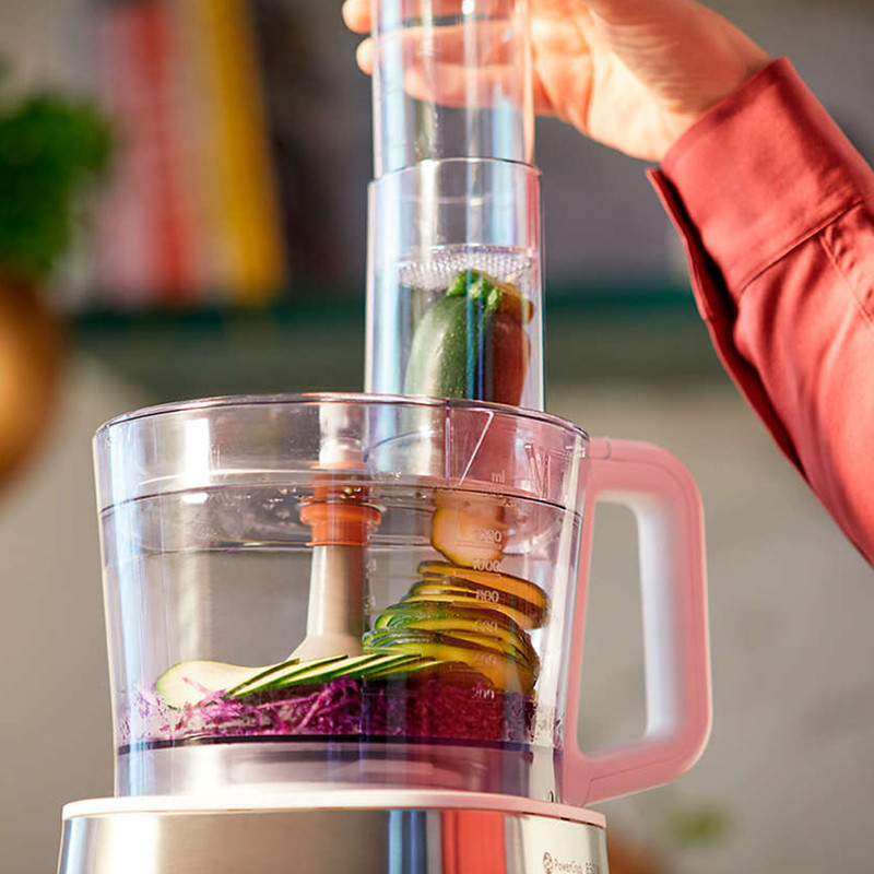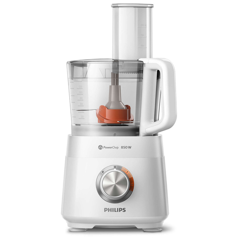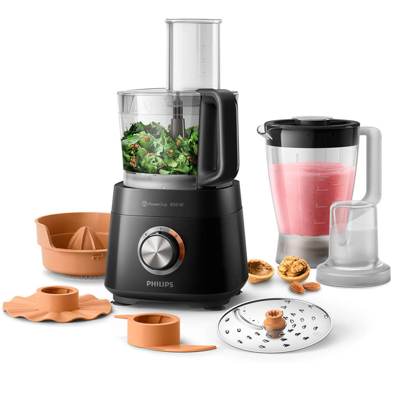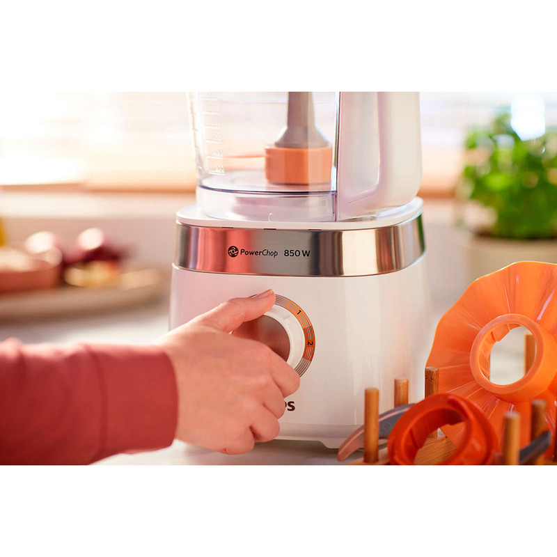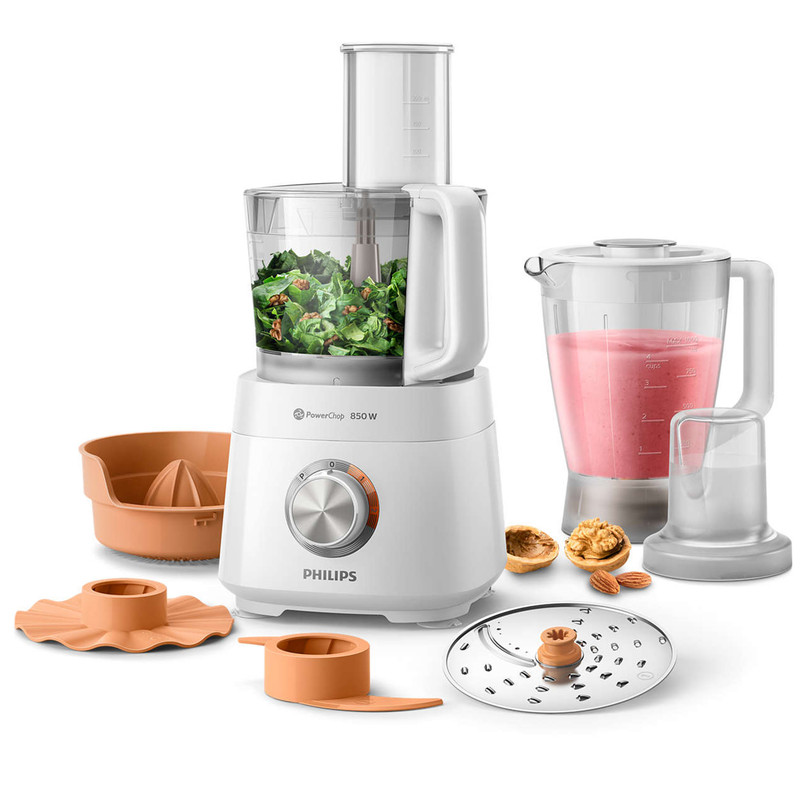 غذاساز فیلیپس مدل HR7520 از سری غذاسازهای Viva Collection برند محبوب و معروف فیلیپس است. این غذاساز از فناوری PowerChop بهره می برد. این فناوری ترکیبی از شکل تیغه، زاویه برش و کاسه داخلی غذاساز است که باعث کارایی بهتر در خردکردن مواد غذایی سخت و نرم می شود. همچنین این ویژگی بسیار برای درست کردن پوره ها و به هم زدن مواد کیک مناسب می باشد! عرض ورودی این غذاساز از نوع XXL است که باعث میشود مواد غذایی یا میوه و سبزیجات را به راحتی و بدون نیاز به تکه تکه کردن به داخل کاسه وارد کنید. مخلوط کن این دستگاه از جنس پلاستیک مقاوم و شفاف است که 1.5 لیتر حجم اسمی دارد اما برای استفاده درست و صحیح از 1 لیتر ظرفیت آن استفاده می شود. موتور غذاساز فیلیپس مدل HR7520 دارای توان 850 واتی است که میتواند همه عملکردهای این غذاساز را پشتیبانی کند و از پس کار هایی مانند زدن خمیر نان، سبزیجات سفت و سخت، دانه های قهوه، پنیر یا شکلات و حتی از خلال کردن و خرد کردن به راحتی بر بیاید. به وسیله این غذاساز شما به بیش از 30 عملکرد دست پیدا میکنید. ورز دادن، خلال کردن، خردکردن، آسیاب و آبمیوه گرفتن تنها گوشه ای از کارایی های این محصول می باشد. برای این دستگاه 2 سرعت مختلف تعبیه شده است؛ از سرعت 1 برای زدن خامه، زدن تخم مرغ، مواد شیرینی و خمیر نان و از سرعت 2 هم برای خردکردن پیاز، چرخ کردن گوشت و ساخت اسموتی استفاده کنید. دیسک رنده و خلال کن این دستگاه به صورت پشت و رو قابل استفاده است و از جنس استیل ضدزنگ می باشد.