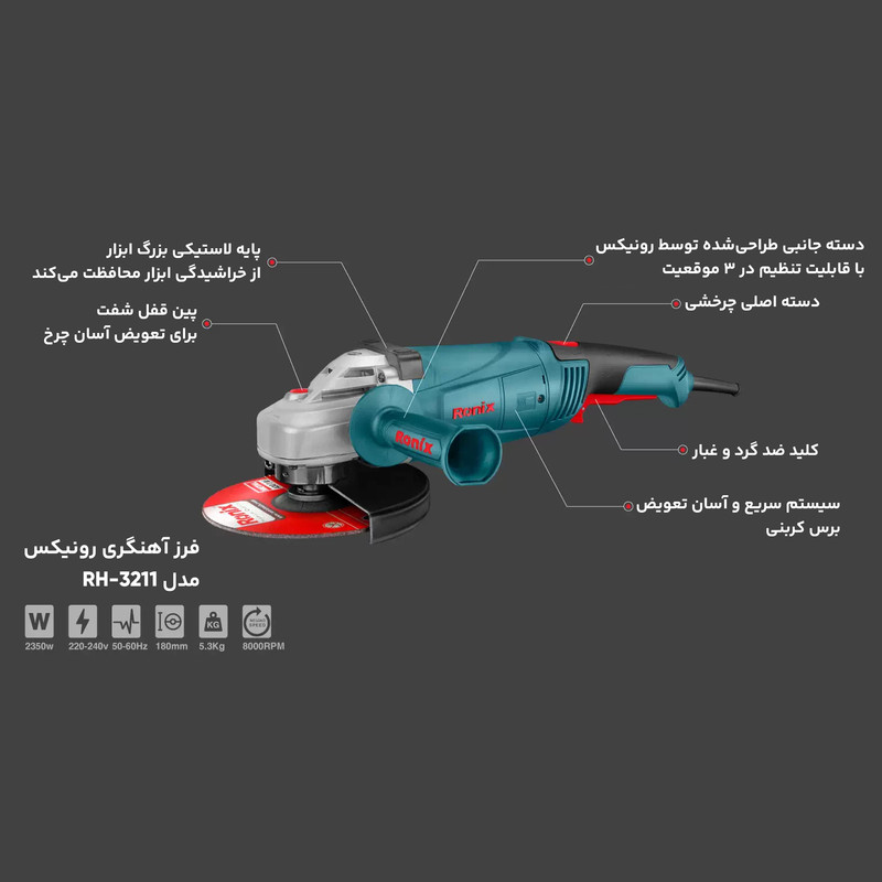 | سایر توضیحات | مجهز به موتور قدرتمند صنعتی با توان 2350 وات – دارای دسته جانبی ضدلرزش طراحی شده توسط رونیکس جهت به حداقل رساندن خستگی کاربر هنگام فعالیت و افزایش دقت عملکرد محصول – مجهز به سیستم گردش هوای داخلی پیشرفته – دارای دسته اصلی گردان جهت افزایش سرعت کار در زوایای مختلف و راحتی و بهبود کنترل کاربر – دارای بلبرینگهای ضد گردوغبار NSK جهت افزایش طول عمر موتور و عملکرد روان تر – قابلیت تعویض سریع و آسان صفحه برش – طراحی منحصربفرد در قسمت جاذغالی جهت تعویض سریع و آسان ذغالها – مجهز به سیستم قفلکن شفت پیشرفته جهت نصب آسان و ایمن صفحه برش – دارای کلید ضد گرد وغبار جهت کاهش نفوذ گرد وغبار به داخل فرز به ویژه در مصارف ساختمانی |