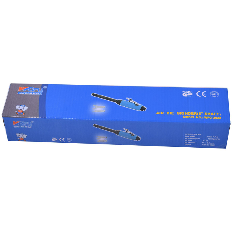 کمپانی ووفو یکی از قدیمی ترین و بهترین سازنده های ابزارآلات بادی در کشور چین به شمار می رود که کار خود را از سال 1979 آغاز نموده است . ظرفیت تولید این کارخانه به بالای 12 میلیون دستگاه در سال می رسد . به دلیل کیفیت ساخت بالا و قیمت مناسب این شرکت توانسته است اکثر محصولات خود را به قاره های آمریکا ، اروپا ؛ آسیا و استرالیا صادر نماید . فرز انگشتی بادی گلو بلند مدل WFG2022 از محصولات ووفو می باشد که سرعت گردش 20000 دور در دقیقه را داراست . بدنه این محصول بسیار خوش دست و ارگونومیک طراحی و ساخته شده است از این دستگاه می توان جهت برش، سایش و یا پولیش فلزات ، چرخ ها و … استفاده نمود . به همراه این دستگاه کولت با سایز 3 و 6 میلی متر ، آچار و کوپلینگ ارائه شده است .