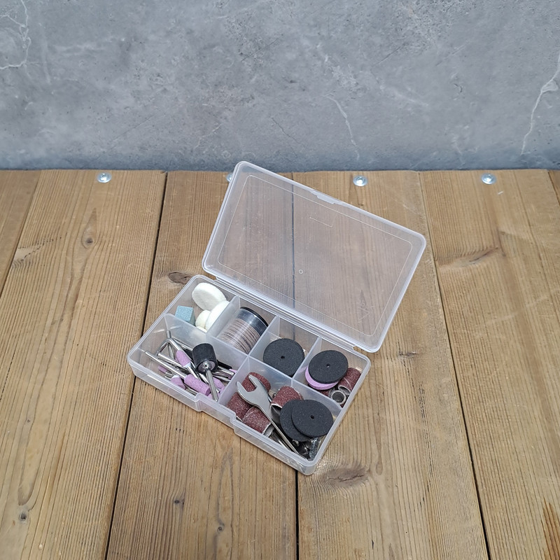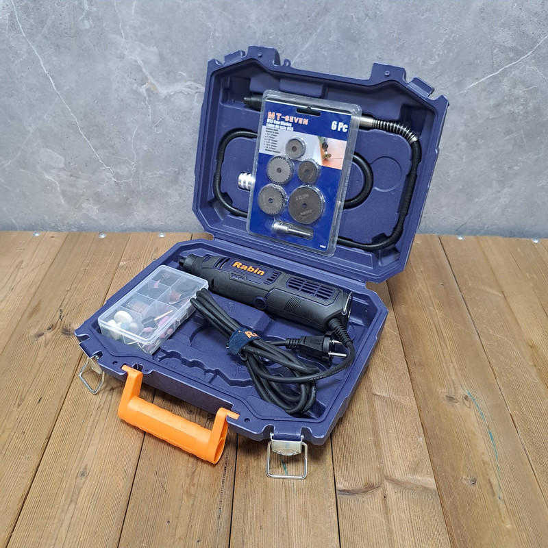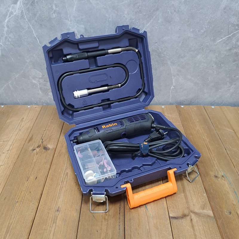 فرز انگشتی107 پارچه رابین « 130W» یکی از مدلهای با کیفیت و کارآمد تولید شده توسط شرکت رابین است. این مدل بسیار با دوام و با کیفیت و البته خوش دست طراحی شده تا بتوانید از آن سالیان طولانی استفاده کنید. خوش دست بودن دستگاه فرز انگشتی رابین موجب شده تا در استفادههای طولانی مدت، اصلا احساس خستگی نکنید. فرز انگشتی رابین با قطعات مختلف و متنوعی همراه شدهاند که همگی بسیار منظم و مرتب در جعبه قرار میگیرند. پس از استفاده از فرز انگشتی میتوانید تمامی قطعات را در جعبه قرار دهید تا از گم شدن آنها جلوگیری شود. فرز رابین با موتور 130 واتی و قابلیت تنظیم سرعت تولید شده است. با وجود این موتور خوب و البته قطعات همراه فرز میتوانید انواع کارهای مختلف را با فرز انگشتی رابین انجام دهید. با استفاده از این فرز میتوانید کار فرز کاری، ساب زنی، حکاکی و … را بر روی متریالهای مختلفی از جمله سنگ، فلز، پلاستیک، چوب و … انجام دهید.