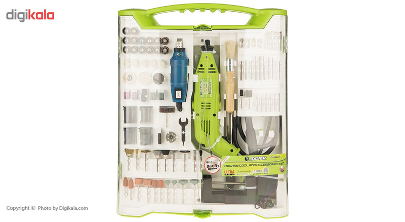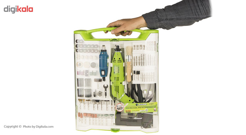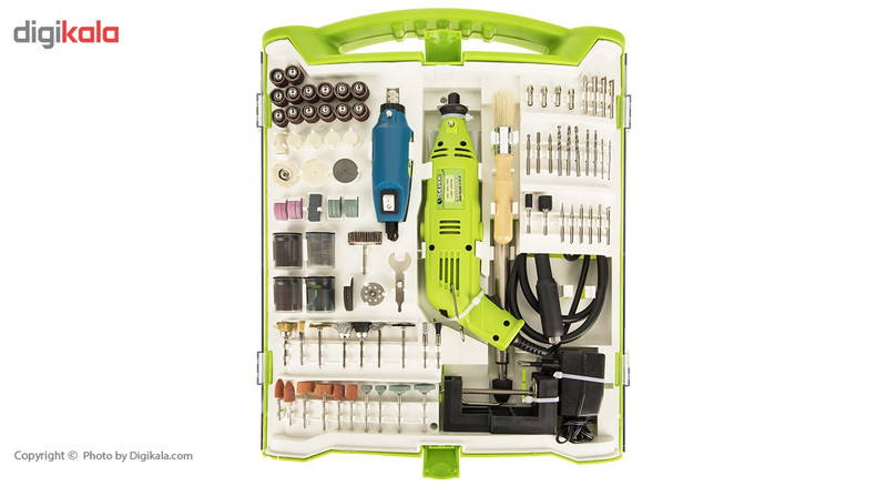 | اقلام همراه | دارای 28 سری سنبادهزن دارای 1 سری پارچهای دارای 5 سری نمدی دارای 1 سری نمدی نقطهای دارای 7 عدد جلازن دارای 2 سری میلهای سنبادهزن دارای 6 سری الماسی دارای 3 سری فلزی دارای 6 عدد مته آلومینیوم اکسید دارای 6 عدد سری آلومینیوم اکسید دارای 4 عدد مته سیلیکون کاربید دارای 6 عدد سری سیلیکون کاربید دارای 9 عدد برس دارای 1 آچار دارای 4 عدد ماندلر دارای 4 عدد کولت دارای 5 سری فیبر شیشهای دارای 1 برس با دسته چوبی دارای 1 عدد شفت انعطافپذیر بهطول 105 سانتیمتر دارای 1 میله یدکی دارای یک نگهدارنده دارای 1 خردکننده کوچک و آداپتور دارای 1 سنباده لاستیکی دارای 1 جلازن ترکیبی دارای 30 عدد سری برش برای کارهای سنگین دارای 46 سری برای کارهای معمولی دارای 44 عدد صفحه سنبادهای دارای 1 سری سنباده سنگ دارای 1 چرخ سنباده دارای یک خرطومی بهطول 110 سانتیمتر دارای یک عدد گیره |