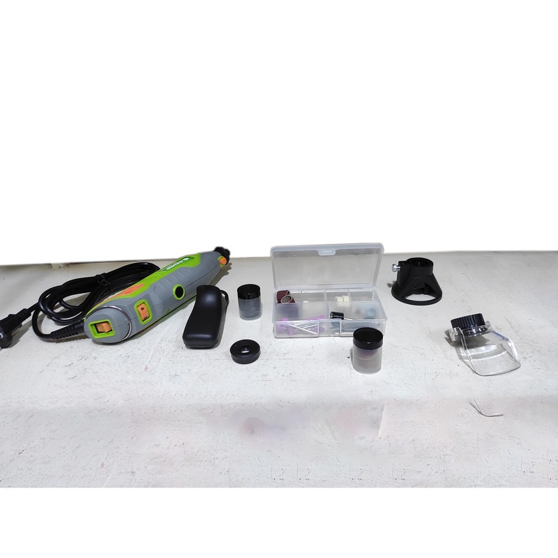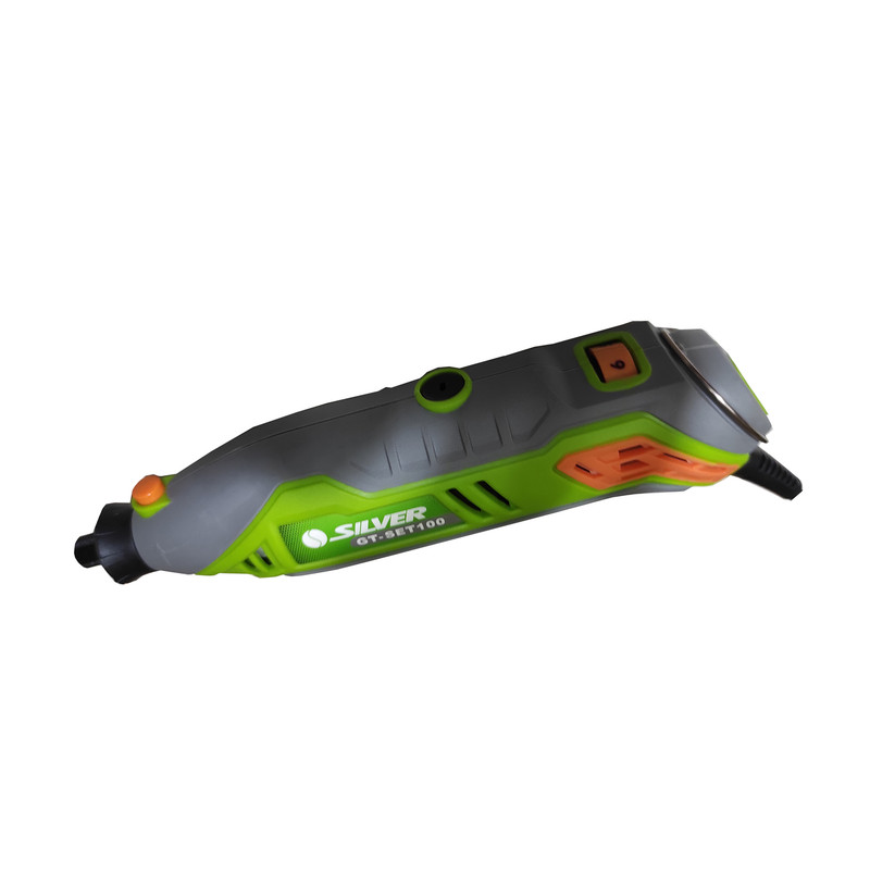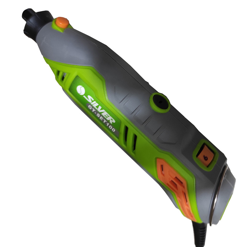 فرز حکاکی انگشتی 100 پارچه سیلور ، با توان 130 وات فرزکاری و ظریف کاری سطوح را عالی انجام می دهد یک شلنگ خرطومی به همراه لوازم جانبی های کاربردی فرز حکاکی 100 پارچه سیلور ، دارای دستگاه دیمردار دور متغیر می باشد سرعت متغیر (10000 تا 32000 دور در دقیقه) دارای کولت با قطر 3 میل بدون لرزش و کم صدا
