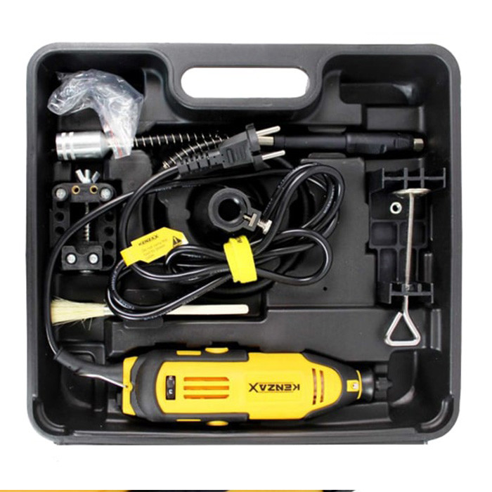 دستگاه های مرغوب تولید شده در کشور چین از برند KENZAX فرز مینیاتوری استفاده برای کار روی چوب، فلز، شیشه و… مجهز به کولت با ظرفیت 3.2 میلی متر و دارای قفل تجهیز شده به موتور نیرومند 180 وات با فرکانس 50 هرتز قابلیت تنظیم سرعت حرکت به کمک کلید دیمر 35000 – 15000 دور در یک دقیقه میزان سرعت چرخش و تهویه اتوماتیک هوا به لطف شیار های روی بدنه طراحی ارگونومیک بدنه با روکش سیلیکونی ضد لغزش .
