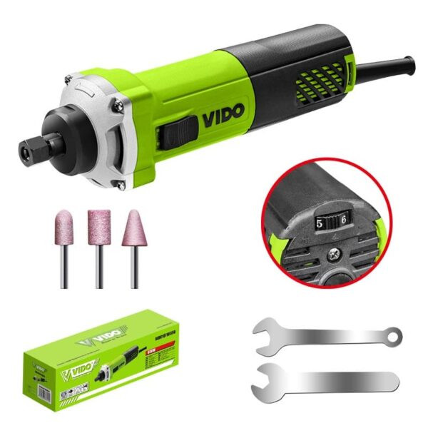 امروزه از انواع فرز انگشتی برای کاهش قطر، پرداخت، حکاکی، پاک کردن رنگ و انجام کارهای هنری استفاده میشود. برند ویدو به عنوان یکی از معتبرترین تولید کنندههای ابزار آلات فنی، مدلهای مختلفی از فرز انگشتی را هم عرضه میکند. فرز انگشتی WD010710650 ویدو یکی از کاربرذیترین مدلهای موجود است. توان این ابزار 650 وات بوده و ولتاژ مورد نیاز آن 240-220 ولت است. حداکثر سرعت حرکت آزاد فرز انگشتی نامبرده 30000 دور در دقیقه تعیین شده است. وزن فرز انگشتی WD010710650 ویدو 1.5 کیلوگرم است. طراحی ارگونومیک، بدنه مقاوم و طول عمر بالا نیز از جمله دیگر ویژگیهای این دستگاه محسوب میش