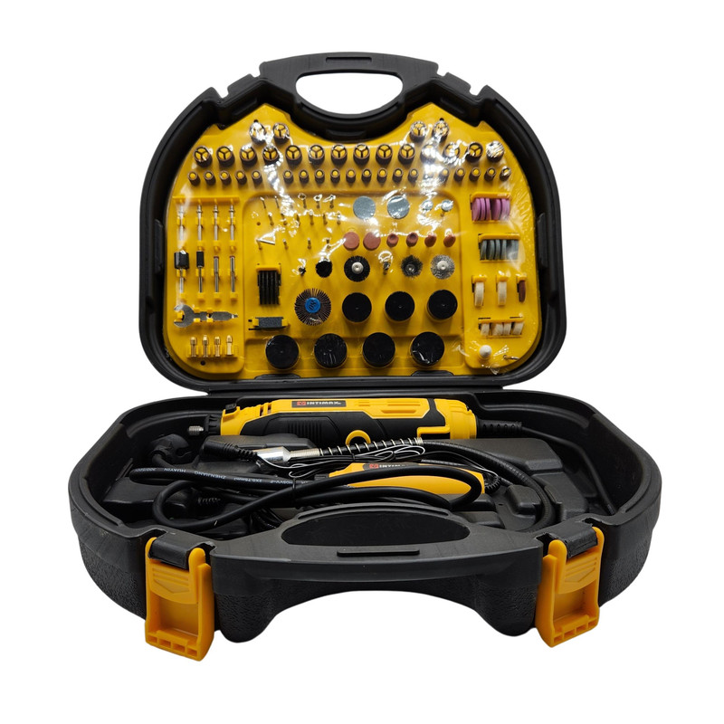 xاین فرز دارای دو موتور می باشد که یکی بزرگ و برای کارهای سنگین و دیگری کوچک و برای کارهای سبک تر استفاده میشود. البته در این مجموعه یک عدد شلنگ خرطومی وجود دارد که برای افراد حرفه ای مناسب است. چندین کولت در این مجموعه وجود دارد که تا سایز 3.2 میلیمتر را شامل می شود. توسط کلید تنظیم سرعت در این دستگاه شما میتوانید سرعت را از 8000 الی 35000 دور بر دقیقه تنظیم کنید. تمام آن چیزی که شما نیاز دارید در این مجموعه تعبیه شده است و خیالتان را برای عدم خرید لوازم جانبی راحت می کند. این مدل فرز انگشتی بسیار با دوام و با کیفیت و البته خوش دست طراحی شده تا بتوانید از آن سالیان طولانی استفاده کنید. خوش دست بودن دستگاه فرز انگشتی فوق موجب شده تا در استفاده های طولانی مدت، اصلا احساس خستگی نکنید. این دستگاه با قطعات مختلف و متنوعی همراه شده اند که همگی بسیار منظم و مرتب در جعبه قرار میگیرند. پس از استفاده از فرز انگشتی میتوانید تمامی قطعات را در جعبه قرار دهید تا از گم شدن آن ها جلوگیری شود. فرز فوق با موتور فوق الهاده قوی و قابلیت تنظیم سرعت تولید شده است. با وجود این موتور خوب و البته قطعات همراه فرز میتوانید انواع کارهای مختلف را با این فرز انگشتی انجام دهید. با استفاده از این فرز میتوانید کار فرز کاری، ساب زنی، حکاکی و … را بر روی متریال های مختلفی از جمله سنگ، فلز، پلاستیک، چوب و … انجام دهید. از فرزهای انگشتی میتوانید در انواع صنعت های مختلف برای کارهای هنری و خانگی استفاده کنید. فرز انگشتی برای کارهای های ظریف و البته برای استفاده در مکان هایی که دسترسی به آن ها دشوار است میتواند گزینه ای مناسب و ایده آل باشد.