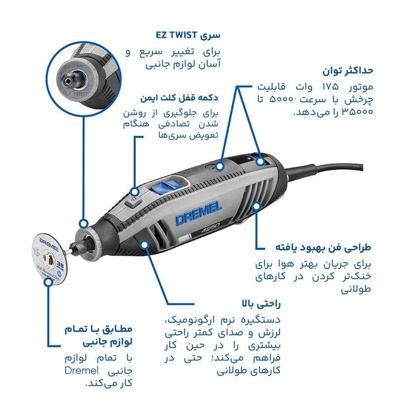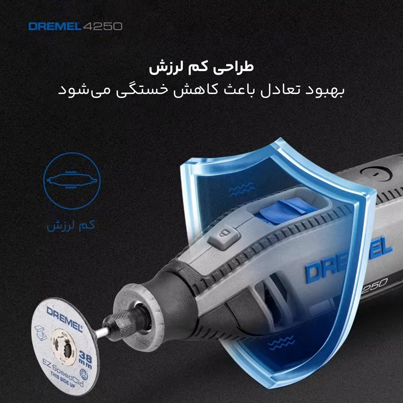 فرز مینیاتوری سری 4250 با بالاترین عملکرد چندکاره در رده فرزهای مینیاتوری با قابلیت های گستره یکی از بهترین مدل های شرکت درمل می باشد که از هر لحاظ مدل بروز شده می باشد که در آوریل 2021 معرفی و به بازار عرضه گردیده است. شما با در اختیار داشتن این محصول دیگر بابت قدرت و ظرفیت کاری هیچ محدودیتی در اجرا نخواهید داشت و با توجه به طراحی خلاقانه شرکت در بدنه دستگاه محل قرارگیری شستی روشن و خاموش و ولوم بهینه شده کنترل سرعت دستگاه براحتی و بدون احسای خستگی عملکردی فوق العاده در اجرای پروژه های خود خواهید داشت. این سری همانند سایر مدلهای جدید مجهز به سیستم EZ TWIST™ کلاهک آچاری درمل می باشد، براحتی می توانید سرمته های مورد نیاز خود را سریع تعویض نمایید. در این کیت 35 پارچه کاربردی تمام متعلقات که برای استارت پروژه خود نیاز دارید را شرکت درمل پیشبینی کرده است همگی اینها را در یک کیف برزنتی جادار ارائه داده است که براحتی می توانید تمام متعلقات لازم را حمل نمایید. شما می توانید با پیشرفت روند پروژه خود تمام ملزومات و متعلقاتی را که لازم دارید از آرشیو کامل ایران پرو خریداری نموده و به کیت خود اضافه نمایید.
