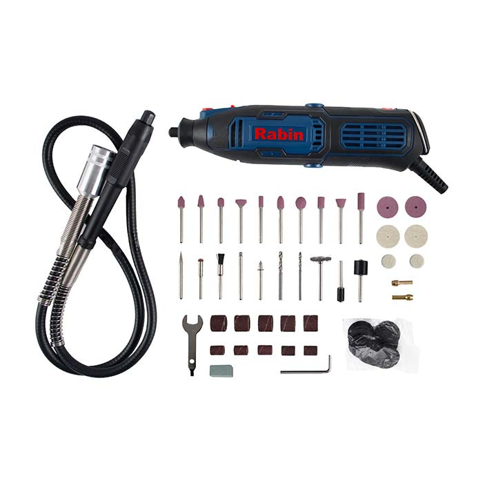 فرز مینیاتوری رابین مدل R3110 دارای موتور 130 وات زغالی با سرعت 10000 تا 35000 دور در دقیقه است و در داخل یک کیف BMC همراه با مجموعه 107 پارچه لوازم جانبی و لوله خرطومی عرضه میشود.