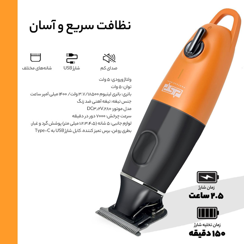 ماشین اصلاح دی اس پی مدل 90970 یک ماشین اصلاح با طراحی زیبا و بهره گرفته از تکنولوژی جدید در طراحی تیغه و بدنه است. این ماشین اصلاح دارای امکان تنظیم تیغه برای صفر زنی با استفاده از پیچ های تعبیه شده در پشت تیغه است. همچنین طراحی آرگونومیک باعث می شود به راحتی در دست جای بگیرد. مدت زمان شارژ دستگاه دو نیم ساعت و به همین میزان هم در زمان کار باطری دوام خواهد داشت. برای حفظ دستگاه و عمر طولانی تر قطعات الکترونیکی همراه این دستگاه یک عدد آداپتور متناسب با نیاز برقی دستگاه قرار داده شده است که مشخصات آن در تصاویر آلبوم قابل ملاحظه است. برای افزایش کارایی دستگاه همواره تیغه ها را روغن کاری کنید، همچنین برای افزایش دوام کله شارژ، زمانی که دستگاه شارژ شد، کلگی را از پریز برق خارج نمایید.