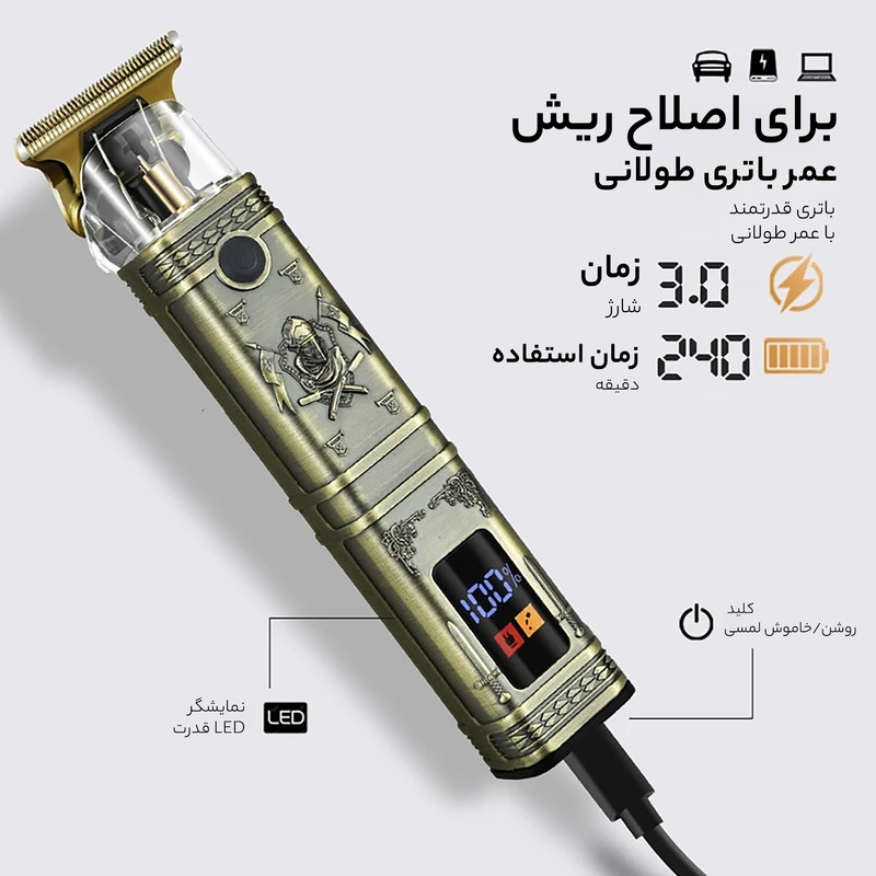 | سایر مشخصات | تکنولوژی اصلاح: برش مستقیم :white_check_mark: جنس تیغهها: استیل ضد زنگ :white_check_mark: نوع: خط زن و صفر زن :white_check_mark: منبع انرژی: باتری 1200 میلی آمپر :white_check_mark:مدت زمان شارژ کامل: 3 ساعت :white_check_mark: مدت زمان قابل استفاده: 4 ساعت :white_check_mark: بیشترین دور موتور: 7500 دور در دقیقه :white_check_mark: حالت توربو: دارد :white_check_mark: صفحه نمایش: دارد |