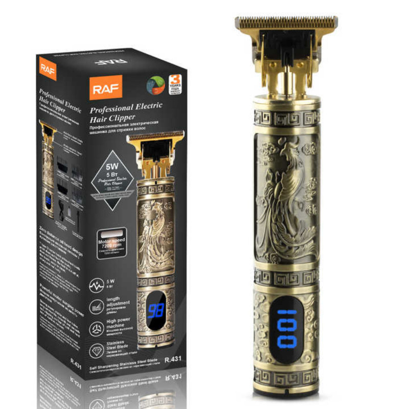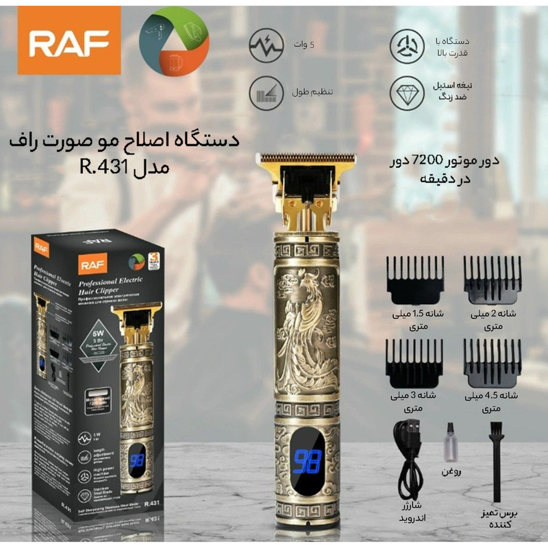 ماشین اصلاح موی صورت راف مدل R.431 از سری ماشین اصلاحهای بسیار زیبا و باکیفیت تولید شده این شرکت می باشد. موتور این ماشین اصلاح از توان مصرفی 5 وات بهره برده شده است که سرعت موتور را به 7200RPM می رساند. تیغه این ماشین اصلاح موی صورت از جنس استیل ضد زنگ از نوع خود تیز شونده است که استفاده دراز مدت نیز تیز باقی می ماند و خبری از کند شدن نیست. از دیگر ویژگی های این ماشین اصلاح می توان به صفحه نمایش ال ای دی بر روی بدنه دستگاه اشاره کرد که علاوه بر زیبایی بیشتر، میزان شارژ دستگاه نیز نشان می دهد. ماشین اصلاح راف مدل R431 توانایی اصلاح با شماره صفر را دارد. اما باید توجه داشته باشید که مانند یک شیور نمیتواند عمل کند و عملکرد آن نزدیک به اصلاح صفر و خط زنی است. این دستگاه دارای چهار شانه 1.5، 2، 3 و .4.5 میلیمتری است و همراه با آنها یک فرچه برای تمیزکاری و روغن نیز ارائه میشود. دکمه خاموش/روشن این دستگاه در قسمت زیرین آن قرار دارد و نیروی محرکه آن نیز توسط یک باتری قابل شارژ تامین میشود. از دیگر ویژگی های بسیار مهم این محصول این است که باتری این دستگاه 1200 میلی آمپر ظرفیت دارد و با یک بار شارژ کامل 90 دقیقه به صورت مستمر قابل استفاده می باشد.