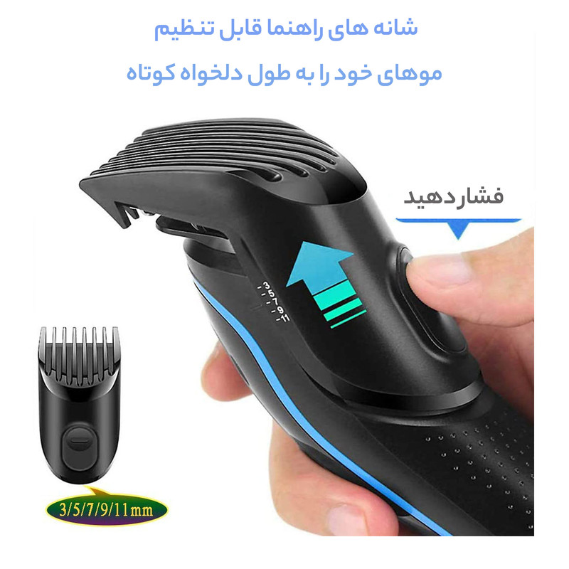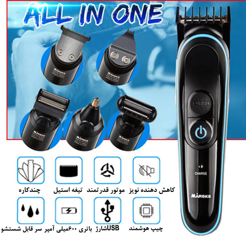 ماشین اصلاح موی سر و صورت مارسکی مدل MS-5010 یک ست کامل برای اصلاح موهای صورت و بدن است. این ست همراه با تجهیزات زیر عرضه میشود: روغن برای استفاده بهتر دستگاه، برس تمیزکننده برای تمیز کردن دستگاه پس از استفاده است. تکنولوژی اصلاح این ست تریمر است و منبع انرژی آن باتری است. تیغههای این ست از جنس استیل ساخته شدهاند. مدت زمان مورد نیاز برای شارژ کامل حدود 90 دقیقه است و پس از شارژ کامل، دستگاه تاحدود 60 دقیقه قابل استفاده است. اقلام همراه این ست شامل سری موزنی، سری اصلاح بدن، سری خط زن، سری ریش تراش فویلی، سری تریمر باریک، سری ریش تراش فویلی پهن و 1 عدد شانه اصلاح است، کابل شارژ USB و یک دفترچه راهنما است. این ست ویژگیهای متنوعی را داراست و با استفاده از تکنولوژی تریمر ، شما میتوانید به راحتی و دقیق اقدام به اصلاح هر قسمتی از صورت و بدن خود کنید.